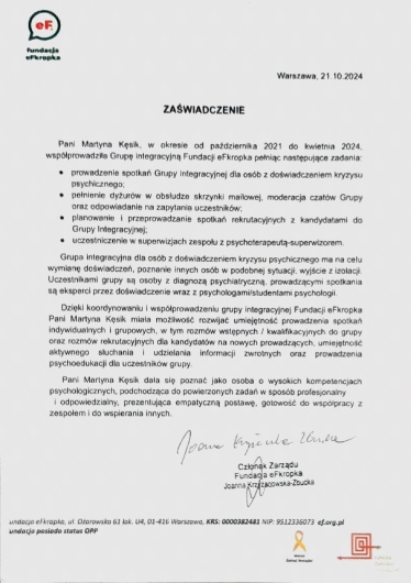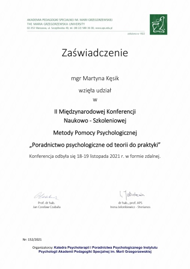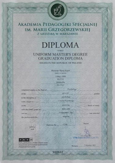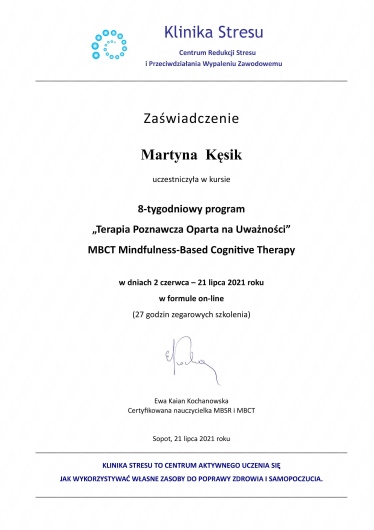 Dbam o podnoszenie swoich kwalifikacji oraz rozbudowywanie warsztatu terapeuty. Od 2022 roku uczestniczę w całościowym kursie psychoterapii poznawczo-behawioralnej.