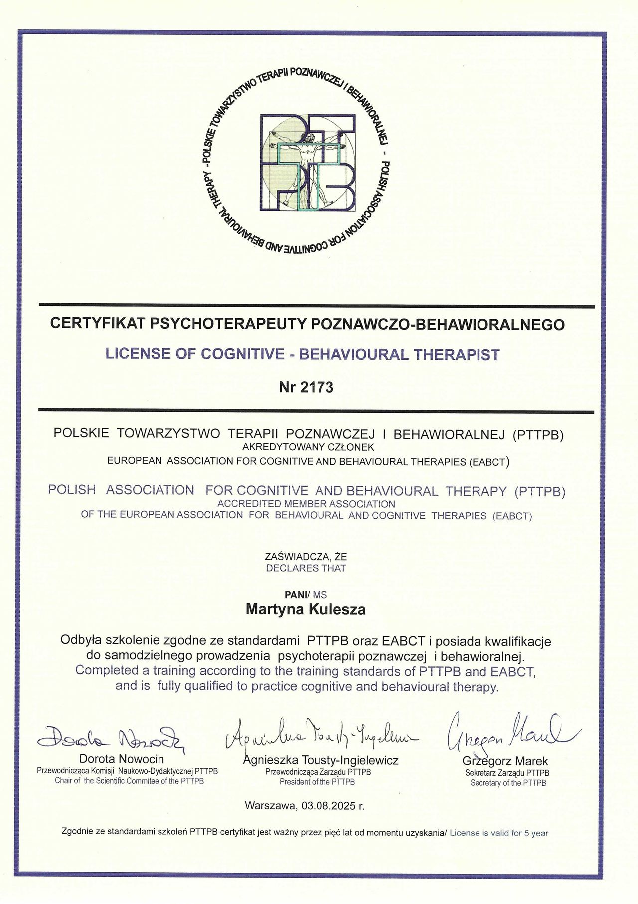 Wczoraj zakończyłem dwuletnią terapię z Panią Martyną Kuleszą. Wspólnie odnieśliśmy sukces, terapia się udała. Dzięki spotkaniom zdiagnozowaliśmy rzeczywiste źródło moich problemów, dowiedziałem się bardzo dużo o sobie samym, o moich słabych i silnych stronach. Terapia pozwoliła mi zrozumieć mechanizm moich zachowań i sposób na ich kontrolę i zmianę, dzięki czemu osiągnęliśmy cel terapii. Bardzo polecam.
