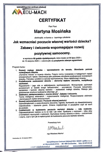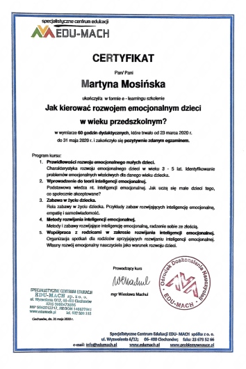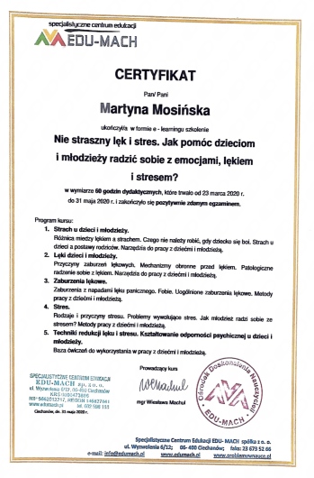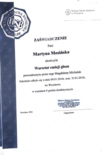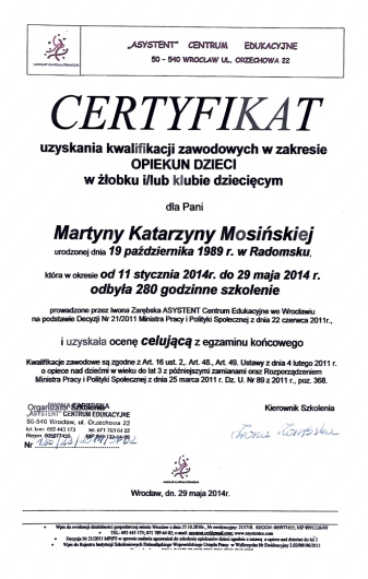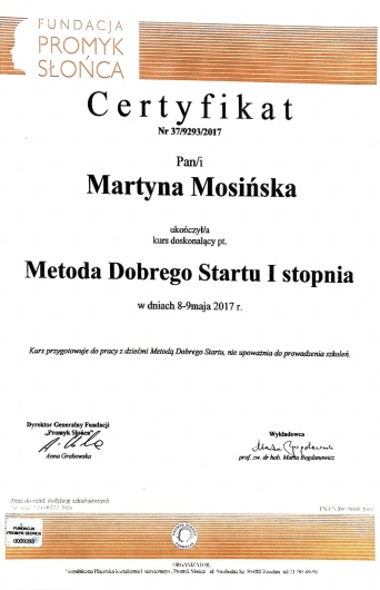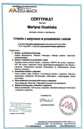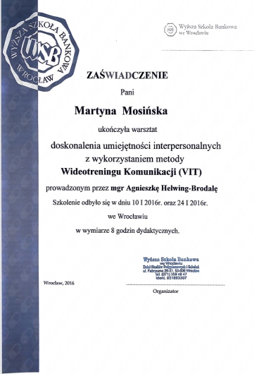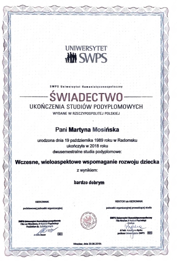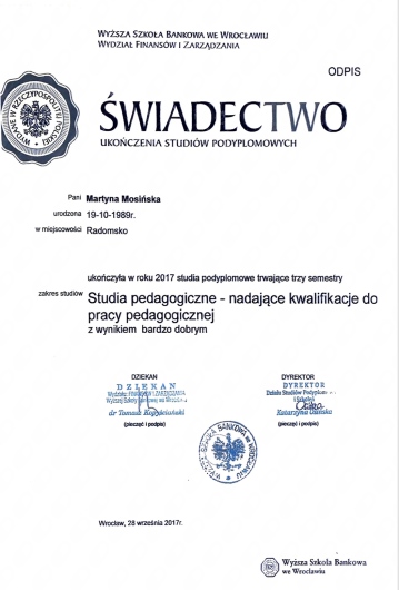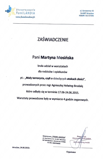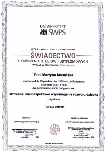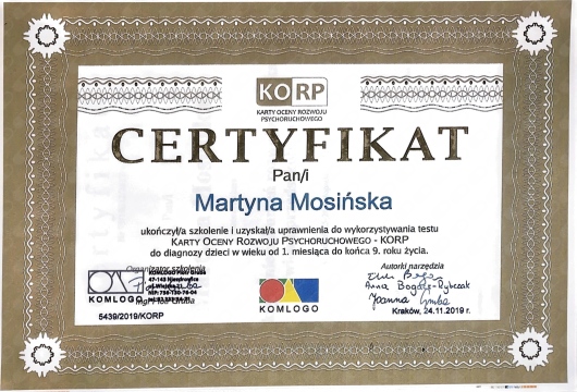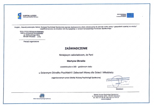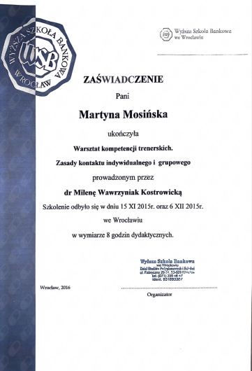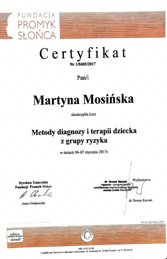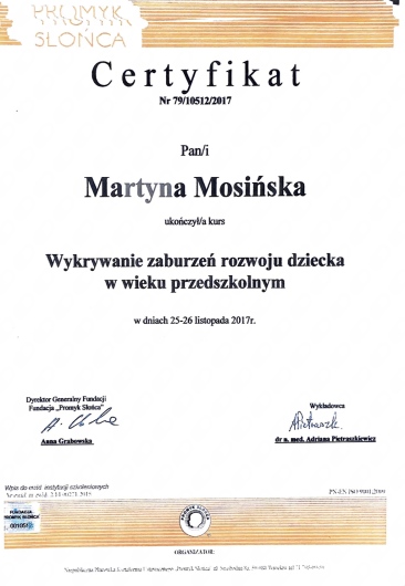Doświadczenie zdobyłam w Dziennym Ośrodku Psychiatrii i Zaburzeń Mowy we Wrocławiu oraz w placówkach edukacyjno-oświatowych i edukacyjno-wychowawczych takich jak: szkoły, dom dziecka. Dodatkowo odbyłam szkolenie uprawniające do korzystania z Kart Oceny Rozwoju Psychoruchowego KORP. W Fundacji Promyk Słońca we Wrocławiu zrealizowałam następujące kursy: Wykrywanie zaburzeń rozwojowych u dzieci w wieku przedszkolnym; Metody diagnozy i terapii dziecka z grupy ryzyka; Metoda Dobrego Startu I stopnia. Inne moje kursy to: Nie straszny lęk i stres. Jak pomóc dzieciom i młodzieży radzić sobie z emocjami, lękiem i stresem?; Jak kierować rozwojem emocjonalnym dzieci w wieku przedszkolnym?; Jak wzmacniać poczucie własnej wartości dziecka? Zabawy i ćwiczenia wspomagające rozwój pozytywnej samooceny; Dziecko z autyzmem w przedszkolu i szkole. Kursy te odbyłam w Specjalistycznym Centrum edukacji EDU – MACH.