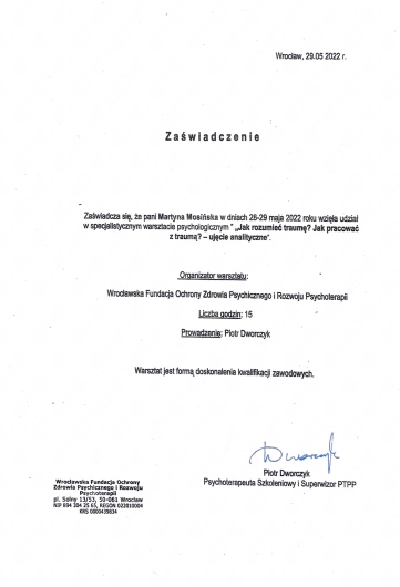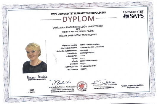 Wiedzę i doświadczenie stale poszerzam biorąc udział w szkoleniach oraz konferencjach. Swoją pracę poddaję regularnej superwizji. Jestem członkinią Polskiego Towarzystwa Psychiatrycznego.