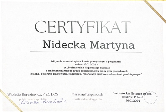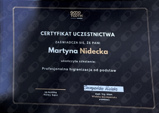 Miałam przyjemność skorzystać z usług higienizacji u Pani Martyny i jestem niezwykle zadowolona! Pełen profesjonalizm, delikatność i dbałość o każdy szczegół sprawiły, że zabieg przebiegł w komfortowej atmosferze. Pani Martyna wszystko dokładnie wyjaśniła, a jej życzliwość i zaangażowanie sprawiły, że czułam się zaopiekowana na najwyższym poziomie. Serdecznie polecam i na pewno wrócę!