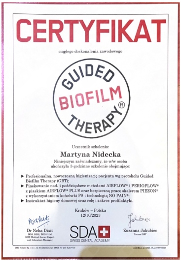 Z pasją edukuję pacjentów, oferując porady i wsparcie w utrzymaniu zdrowych nawyków higienicznych. Chociaż na co dzień pracuję głównie z dorosłymi, z pełnym zaangażowaniem i cierpliwością przyjmuję również dzieci, dbając o to, by od najmłodszych lat poznawały i rozwijały właściwe nawyki higieniczne.