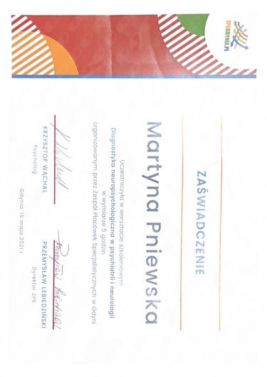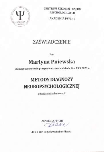 Chciałabym podziękować pani Martynie. Jest bardzo ciepłą, życzliwą psycholog, która zadaje dużo trafnych pytań i prowadzi spotkania w przyjemnej atmosferze, dba o komfort jak tylko to możliwe. Wywiad jest prowadzony szczegółowo za pomocą wielu testów. Pani Martyna jest elastyczna, dostosowuje się do pacjenta, jest wyrozumiała nawet jeśli mój sposób wypowiedzi był chaotyczny, gubiłam wątki lub zapomniałam zadane pytanie. Pani Martyna tłumaczy spokojnie i dopytuje, nie wyśmiewa, rozumie i można poczuć się wysłuchanym, być sobą i można jej zaufać. Diagnoza przebiegła sprawnie i szybko. Potrafi wyciągać wnioski, na podstawie badań i obserwacji nakierować co jeszcze należy sprawdzić, a co można już wykluczyć. To kompetentna neuropsycholog, którą z całego serca polecam.