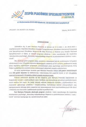 Zajmuję się diagnozą neuropsychologiczną, rehabilitacją funkcji poznawczych pacjentek i pacjentów neurologicznych oraz wsparciem psychologicznym osób hospitalizowanych na P/O Rehabilitacji Neurologicznej Osób Dorosłych w placówce zamiejscowej w Dzierżążnie Kościerskiego Szpitala Specjalistycznego. Doświadczenie zawodowe zdobywałam na stażach w Gdyńskim Ośrodku Interwencji Kryzysowej oraz w Gdyńskim Zespole Placówek Specjalistycznych, pracowałam wsparciowo z młodzieżą zarówno w roli psycholożki jak i streetworkerki.