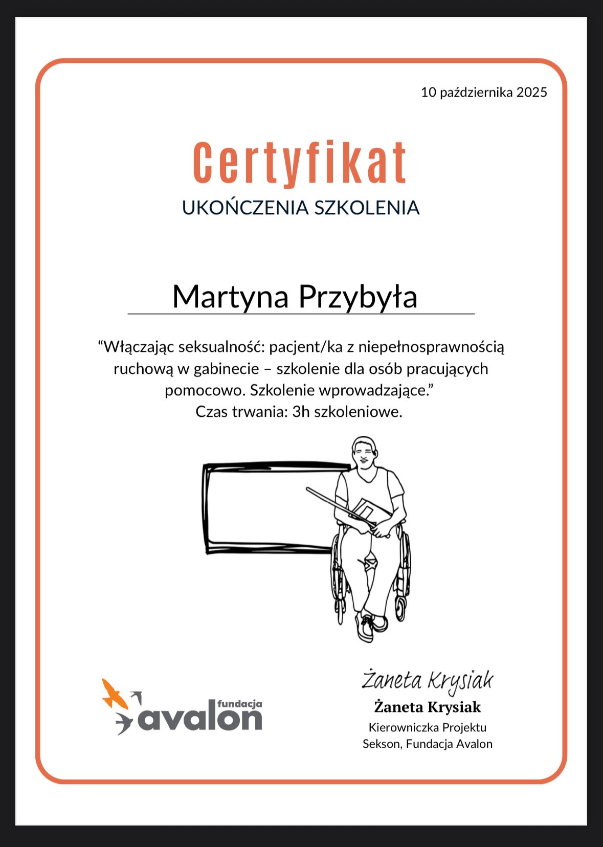 Diagnoza była bardzo wyczerpująca i szczegółowa. Pomimo moich problemów czułam się komfortowo. W razie potrzeby otrzymywałam wsparcie. Cieszę się że skorzystałam z badania u pani Martyny. Serdecznie dziękuję.