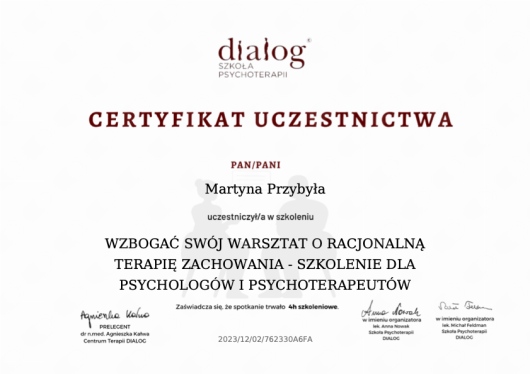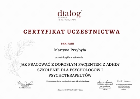 Pani Martyna to przykład specjalisty z powołania. Profesjonalizm i zaangażowanie Pani Martyny, a przy tym przyjazna i luźna atmosfera, to spotykany bardzo rzadko mix. A chyba lepszych warunków nie można stworzyć pacjentowi, by się otworzył i z przyjemnością przyszedł na spotkanie. Jestem po podwójnej diagnostyce neuroróżnorodności i ogromnie polecam wszystkim z podejrzeniami ADHD lub ASD na proces diagnozowania czy terapię właśnie Panią Martynę. Już przy samej diagnostyce można wiele dowiedzieć się o mechanizmach pewnych zachowań i ograniczeń wynikających z tych zaburzeń. Człowiek wychodzi z większą świadomością i akceptacją siebie. Naprawdę lepiej trafić chyba nie można i gdy sytuacja finansowa pozwoli, na pewno powrócę do Pani Martyny na psychoterapię. :)