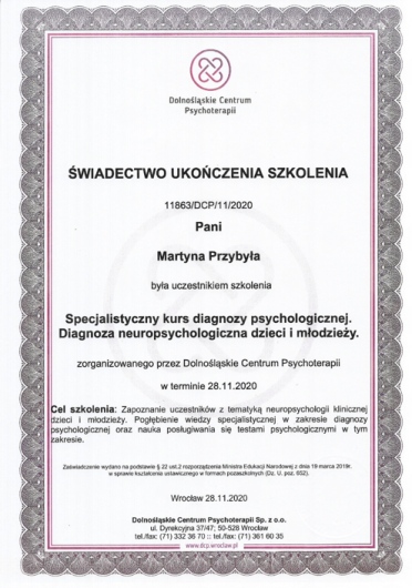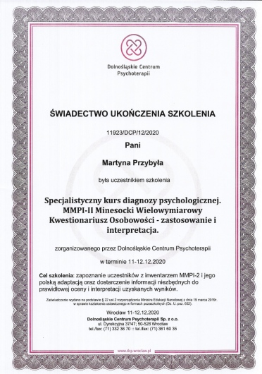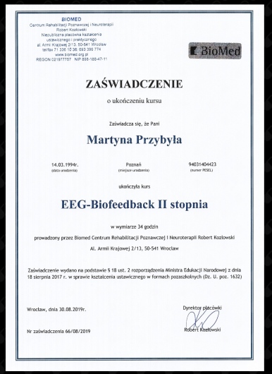 Ukończyłam jednolite studia magisterskie na kierunku psychologia (specjalność: psychologia kliniczna) na Uniwersytecie SWPS w Poznaniu, wcześniej kończąc studia licencjackie na kierunku Polityka Społeczna. Aktualnie jestem w trakcie akredytowanego kursu psychoterapii w nurcie integracyjnym w Wielkopolskim Instytucie Psychoterapii Dzieci Młodzieży Rodziny. Dotychczasowe doświadczenie zdobywałam podczas praktyk studenckich między innymi w Wojewódzkim Szpitalu dla Nerwowo i Psychicznie Chorych „Dziekanka” im. Aleksandra Piotrowskiego w Gnieźnie (oddział ogólny damski, oddział ogólny męski) oraz w Centrum Medycznym HCP (oddział leczenia uzależnień), a także w Szpitalu Klinicznym im. Karola Jonschera na oddziale psychiatrii dziecięcej oraz podczas stażu w Klinice Psychiatrii Dorosłych im. Karola Jonschera Uniwersytetu Medycznego im. Karola Marcinkowskiego w Poznaniu. Ponadto pracuję i udzielam się wolontaryjnie w poznańskiej Fundacji AKME. Koordynowałam badania kliniczne z dziedziny psychiatrii, w których ponadto brałam udział jako badacz. Głównie w zakresie leczenia depresji, schizofrenii oraz chorób neurodegeneracyjnych. W wolnym czasie poza poszerzaniem wiedzy i kompetencji lubię wędrować po górach, zwłaszcza Tatrach. Czytam sporo książek, jeżdzę na rowerze i praktykuję jogę. Jestem osobą bardzo zwierzolubną, moje serce skradły przede wszystkim psy.