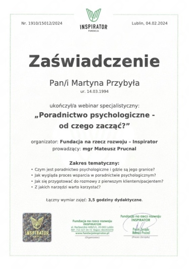 Jaki jest zakres porad oferowanych przez Martyna Przybyła?Martyna Przybyła to psycholog. Na podstawie swojego doświadczenia i wykształcenia Martyna Przybyła oferuje usługi takie jak: Konsultacja psychologiczna online, diagnoza ADHD dla dorosłych, Diagnoza autyzmu, badanie osobowości z opinią, Konsultacja psychologiczna.