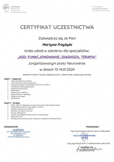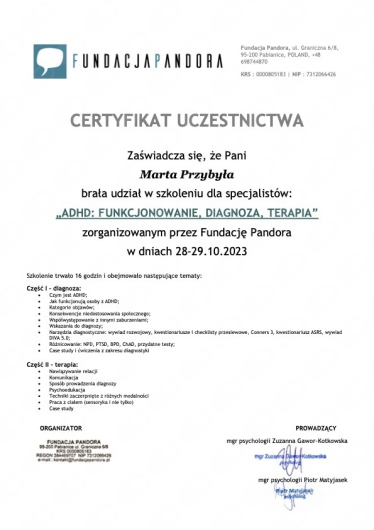 Pani Martyna przyprowadzala u mnie diagnozę ADHD, była bardzo wnikliwa, dociekliwa i jednocześnie empatyczna i z poczuciem humoru