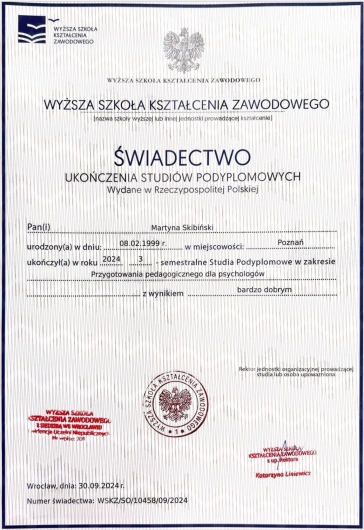 Jak się dziś czujesz? Czy właśnie tak chciałbyś się czuć? Jestem psychologiem w trakcie całościowej 4-letniej szkoły psychoterapii w nurcie poznawczo-behawioralnym oraz certyfikowanym diagnostą ADOS-2 - diagnozuję autyzm u dzieci i dorosłych. Mam ukończone szkolenie z zakresu Terapii Skoncentrowanej na Rozwiązaniach (TSR) oraz z psychotraumatologii. Pracuję z dorosłymi, dziećmi i młodzieżą. Towarzyszę moim pacjentom w drodze do lepszego samopoczucia, większego spokoju i życiowej równowagi. Pomagam osobom zmagającym się z lękiem, depresją, przewlekłym stresem, trudnościami emocjonalnymi czy kryzysem życiowym. Wspieram również mamy w ciąży i po porodzie – w ich emocjach, zmianach i potrzebach. Prowadząc spotkania z dziećmi, pracuję także z ich rodzicami – pomagam lepiej rozumieć zachowania dziecka, budować relację opartą na spokoju i zaufaniu oraz odnaleźć się w trudnych wychowawczych momentach. Posiadam przygotowanie pedagogiczne oraz kwalifikacje do prowadzenia Treningu Umiejętności Społecznych (TUS). W swojej pracy stawiam na autentyczny kontakt, zrozumienie i bezpieczną przestrzeń. Wierzę, że zmiana jest możliwa – czasem trzeba tylko pomocy, by zrobić pierwszy krok. Porozmawiajmy!