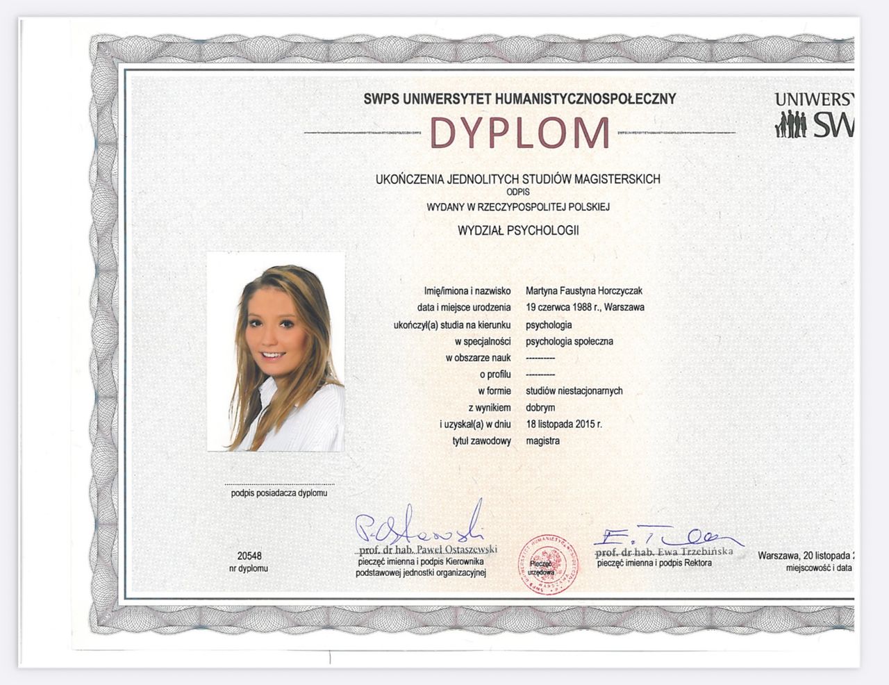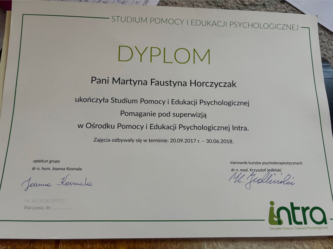 Jestem dyplomowanym psychologiem i psychoterapeutą w trakcie szkolenia. Psychologie ukończyłam w 2015 roku na Uniwersytecie SWPS w Warszawie. Jestem również absolwentką Studium Pomocy Psychologicznej w Ośrodku Pomocy i Edukacji Psychologicznej INTRA. gdzie kontynuuję rozwój zawodowy w 4 letniej Szkole Psychoterapii Dzieci, Młodzieży i Rodzin.