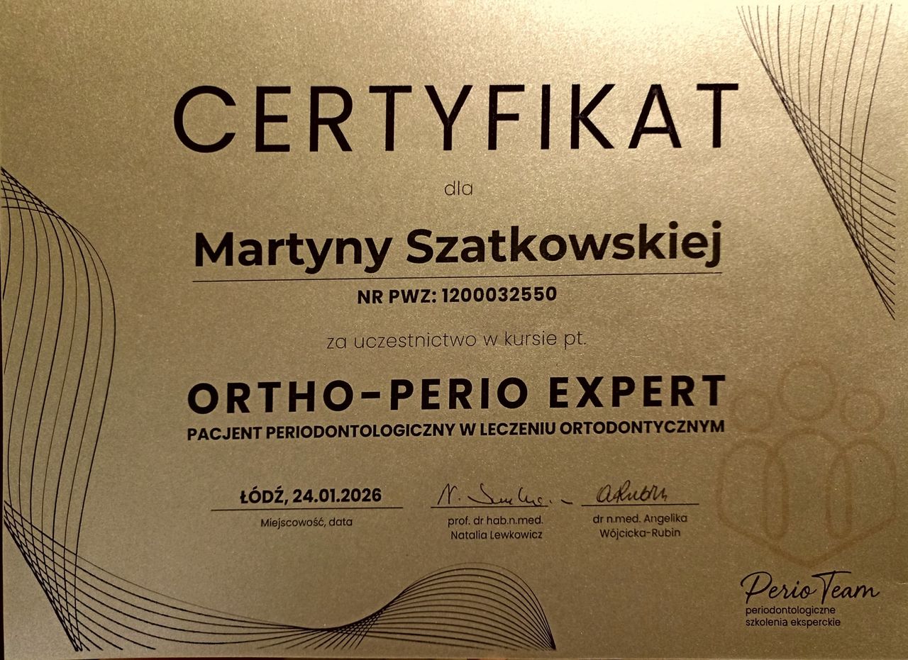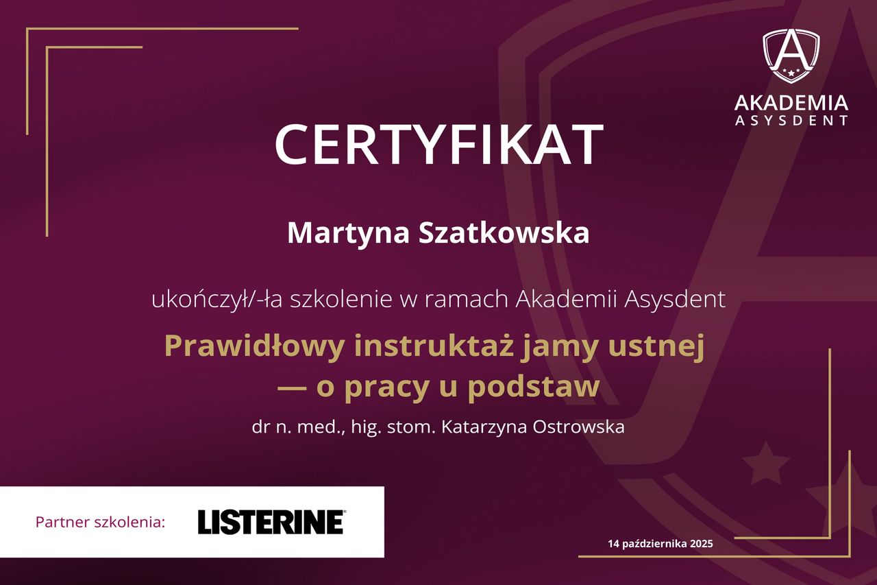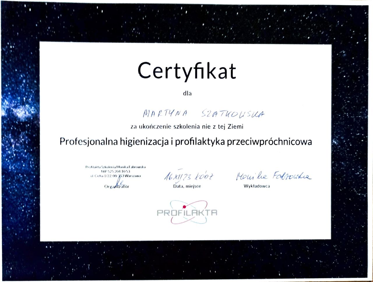 Stale podnoszę swoje kwalifikacje, uczestnicząc w szkoleniach i kursach z zakresu profilaktyki oraz nowoczesnych metod dbania o zdrowie jamy ustnej.