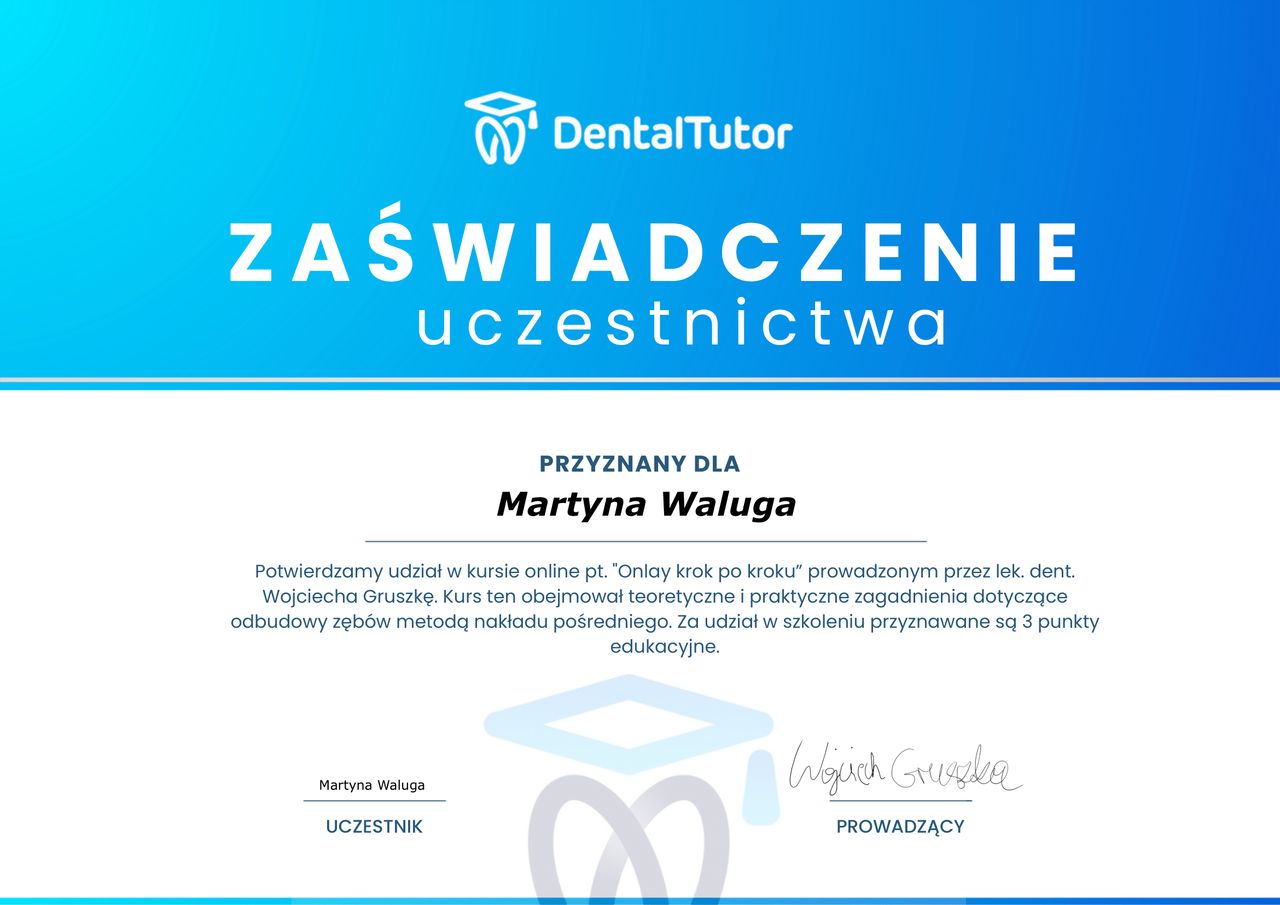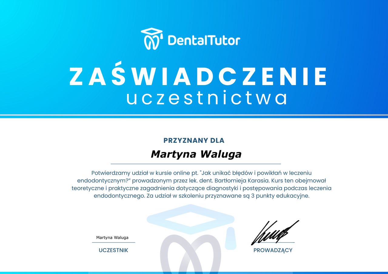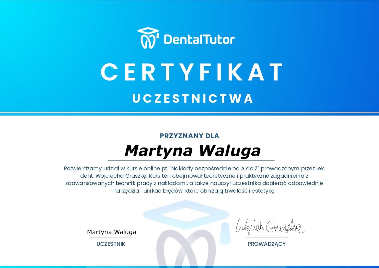 Jestem absolwentką Uniwersytetu Medycznego im. Piastów Śląskich we Wrocławiu. W swojej pracy zajmuję się stomatologią zachowawczą, endodoncją mikroskopową oraz estetyczną odbudową zębów przednich (bondingiem). Pracuję w powiększeniu, z wykorzystaniem mikroskopu i nowoczesnych technologii, co pozwala mi osiągać maksymalną precyzję i trwałość efektów leczenia.