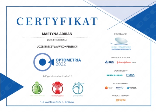 Niezwykle interesującą mnie dziedziną jest stale rozwijający się temat kontroli krótkowzroczności u dzieci. Ich przyszłość i brak ograniczeń zawodowych czy prywatnych w ich dorosłym życiu jest dla mnie niezwykle istotne. Dokładam więc wszelkich starań, aby dobrać jak najlepsze rozwiązanie, które umożliwi zarówno jak najlepsze widzenie u dzieci oraz hamowanie przyrostu krótkowzroczności. Posiadam akredytację do doboru soczewek okularowych spowalniających rozwój krótkowzroczności Miyosmart i Stellest oraz soczewek kontaktowych MiSight.