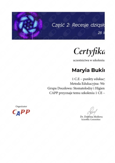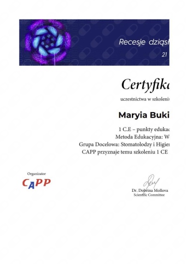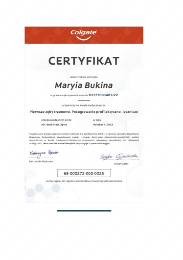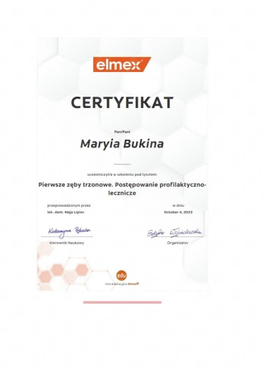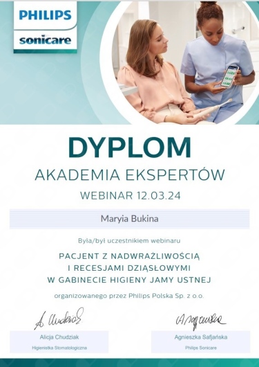 Jaki jest zakres porad oferowanych przez Maryia Bukina?Maryia Bukina to higienistka/higienista stomatologiczny. Na podstawie swojego doświadczenia i wykształcenia Maryia Bukina oferuje usługi takie jak: higienizacja, wybielanie zębów lampą.