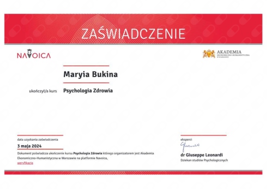 Jak Maryia Bukina umawia wizyty?Maryia Bukina używa kalendarza ZnanyLekarz, dlatego na stronie widzisz aktualne terminy. Wystarczy, że wybierzesz datę i godzinę, które odpowiadają Ci najbardziej. Umawianie wizyty jest darmowe, a tuż przed terminem wyślemy Ci przypomnienie.