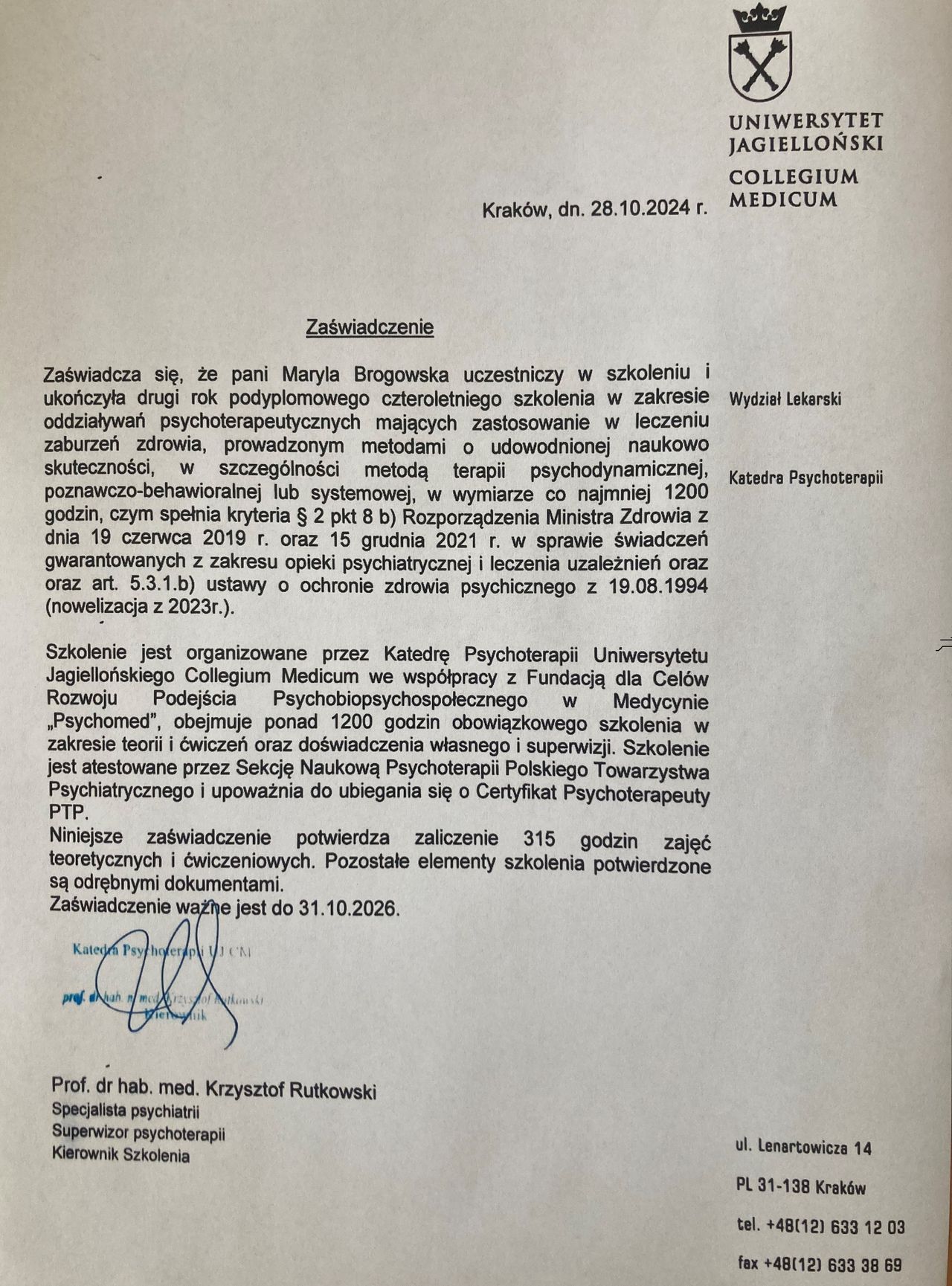 Jaki jest zakres porad oferowanych przez Maryla Brogowska?Maryla Brogowska to psychoterapeuta. Na podstawie swojego doświadczenia i wykształcenia Maryla Brogowska oferuje usługi takie jak: konsultacja psychoterapeutyczna, psychoterapia indywidualna, psychoterapia indywidualna dorosłych online.