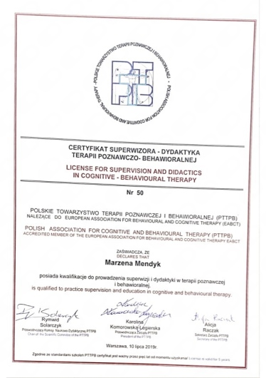 Korzystam od dłuższego czasu z superwizji psychoterapeutycznych u Pani Marzeny. Jestem z nich bardzo zadowolony. Wnoszą one do mojej praktyki bezcenna wiedzę i doświadczenie, które pomagają mi umacniać swój warsztat psychoterapeutyczny. Pani Marzeną ponadto wnosi przyjemny klimat spotkań oraz otwartość na drugiego człowieka. Polecam z całego serca wszystkim terapeutom pracującym w nurcie poznawczo-behawioralnym trzeciej fali.