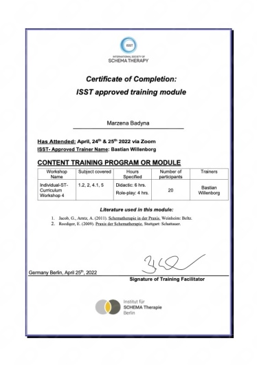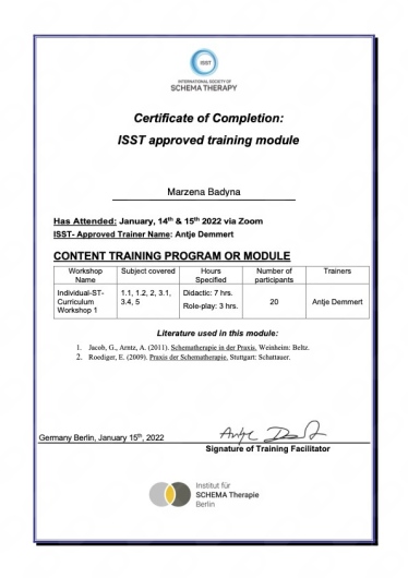 Pracuję w nurcie poznawczo - behawioralnym, dialogu motywującym oraz terapii schematów.