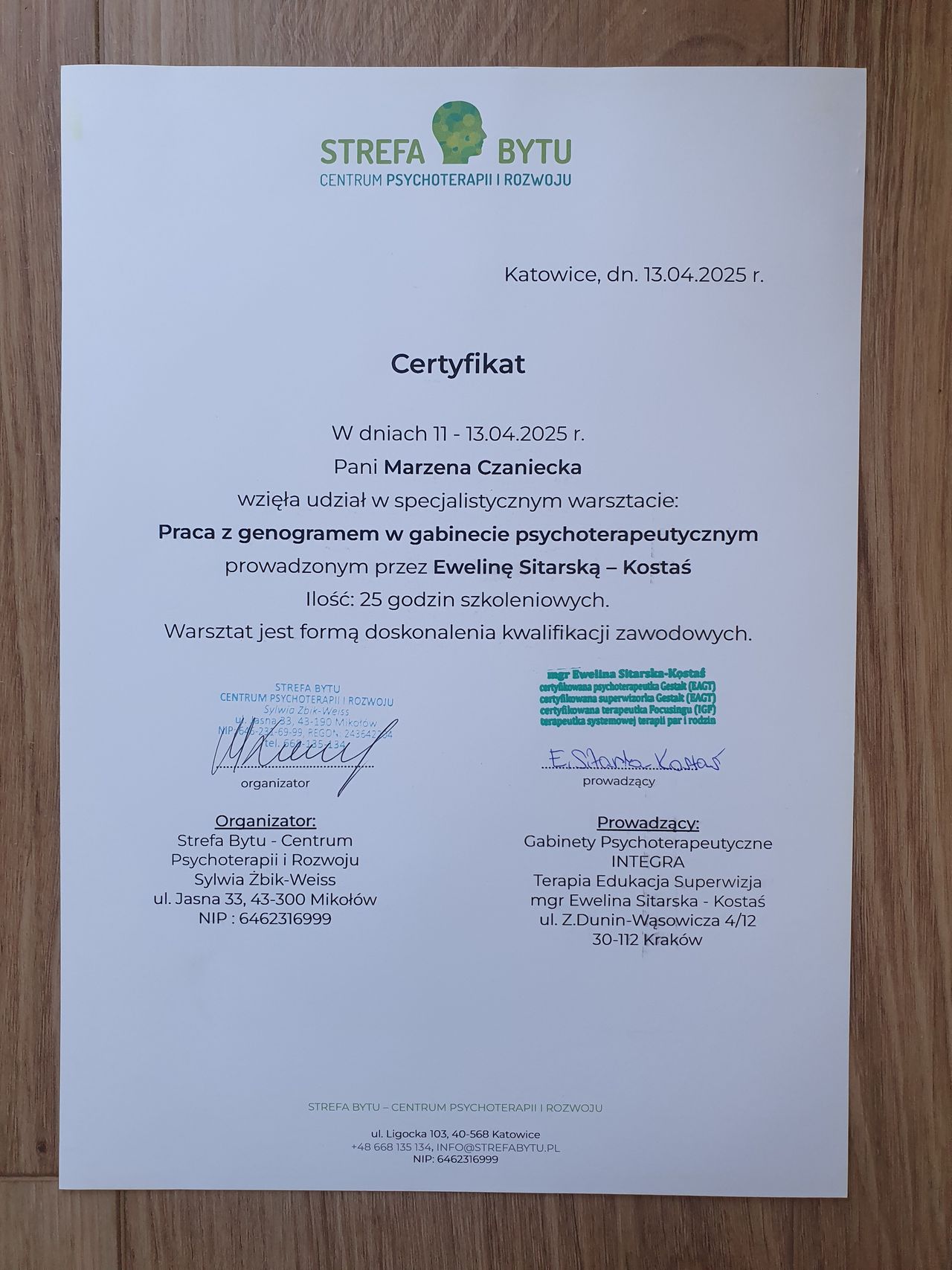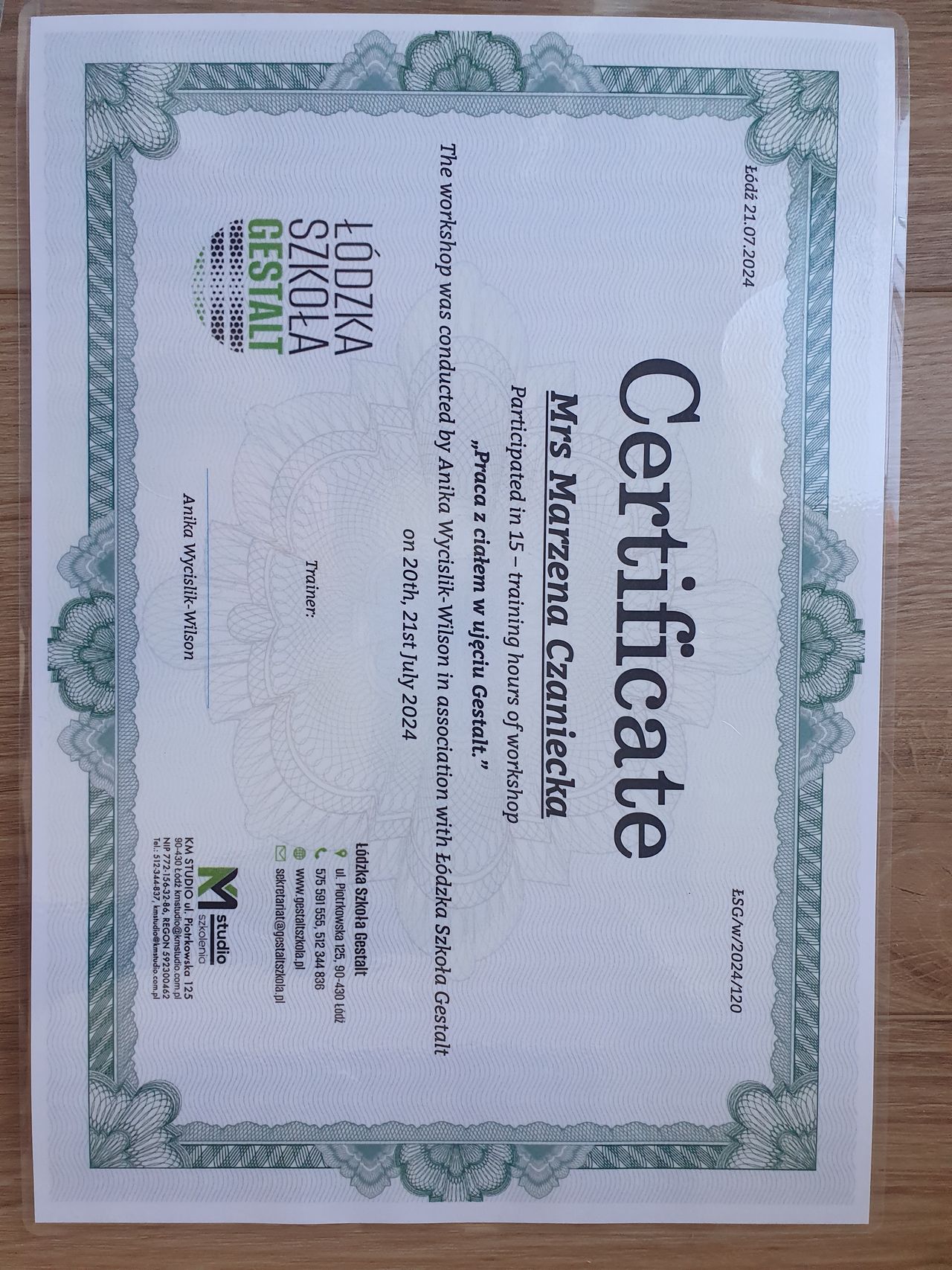 Jestem psychoterapeutką w trakcie certyfikacji (EAGT) w Instytucie Psychoterapii Gestalt w Krakowie. Ukończyłam studia licencjackie na kierunku edukacja artystyczna/pedagogika na Uniwersytecie Katowickim. Kształciłam się rownież w Szkole Trenerów Komunikacji opartej na Empatii w Poznaniu (specjalistyczne, podyplomowe studium rekomendowane przez Polskie Towarzystwo Psychologiczne). Ukończyłam kurs uzupełniający z zakresu psychologii rozwojowej, psychologii osobowości oraz psychopatologii w Śląskim Centrum Psychoterapii i Treningu Gestalt a także pierwszy, dwuletni etap w w/w szkole. Stale pogłębiam wiedzę oraz warsztat co uważam za niezbędne w tak odpowiedzialnym zawodzie.