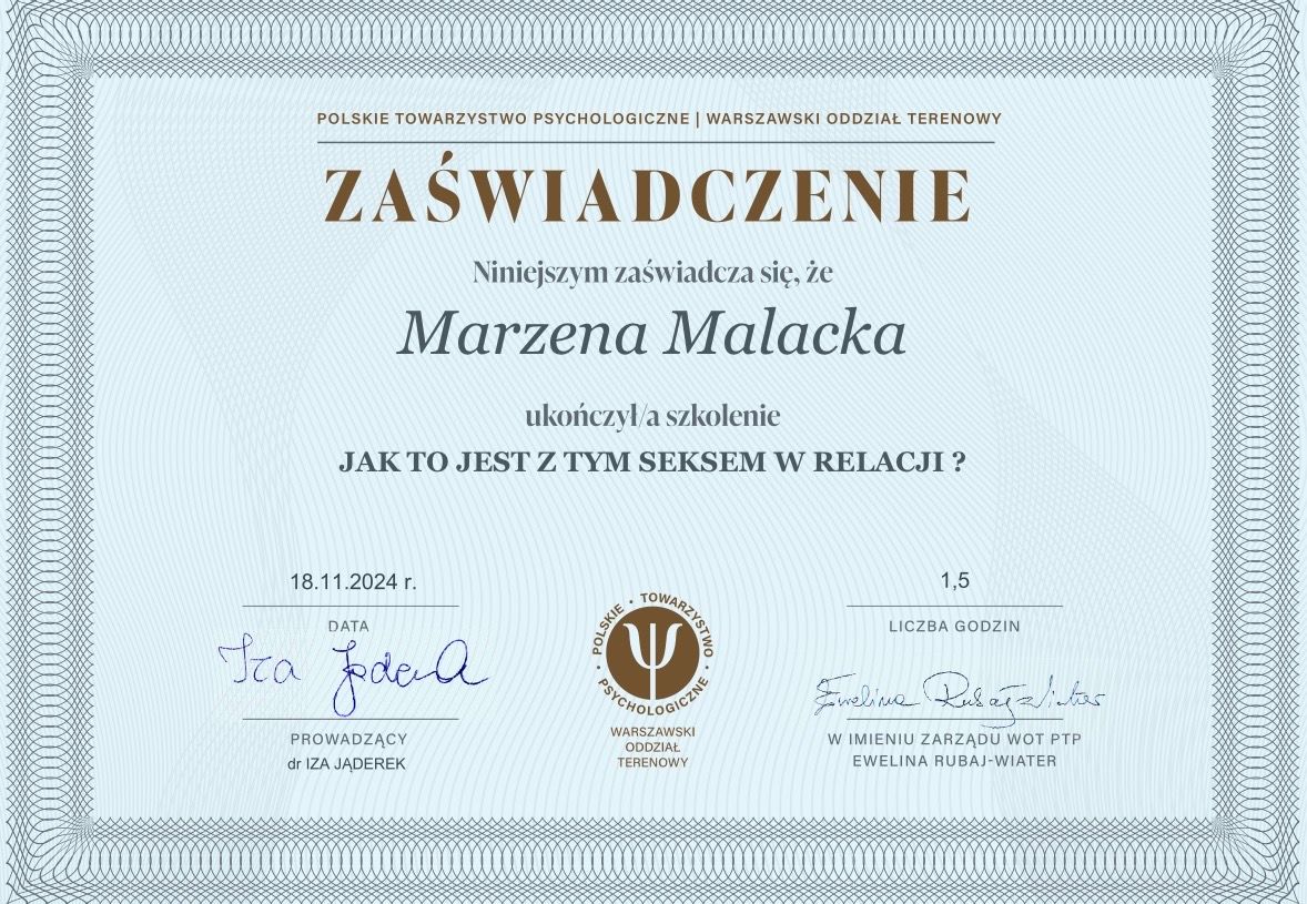 Rozwijając swoją ścieżkę zawodową, ukończyłam szkolenie coachingowe i uzyskałam dyplom Coach Practitioner w akredytowanej przez EMCC placówce Norman Benett. Zrealizowałam liczne szkolenia potwierdzone certyfikatami, uprawniające do pracy z parami i pracy indywidualnej nad emocjami, rozwojem talentów oraz prowadzenia praktyki mindfulness, co pozwala mi holistycznie odpowiadać na potrzeby pacjentów.