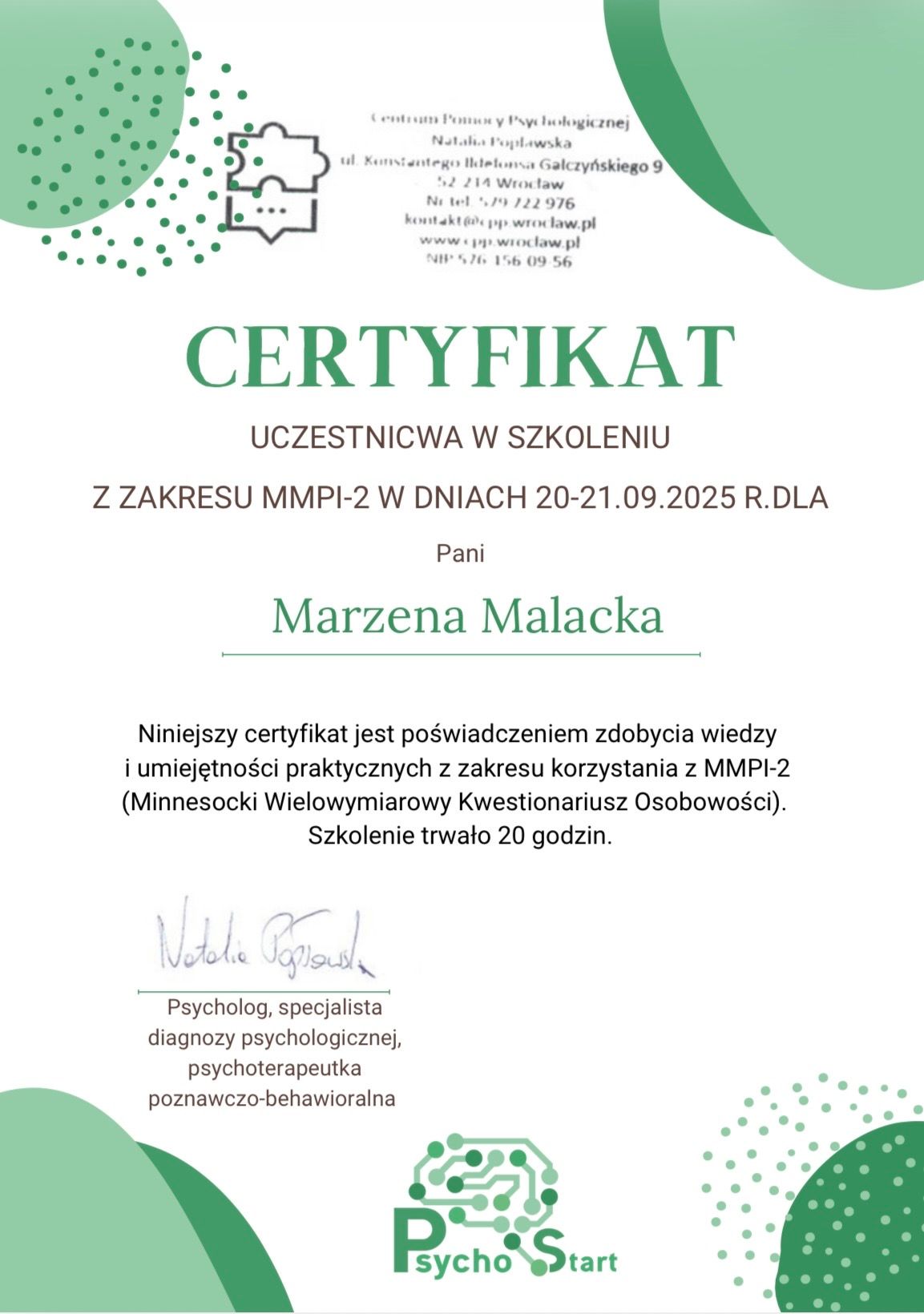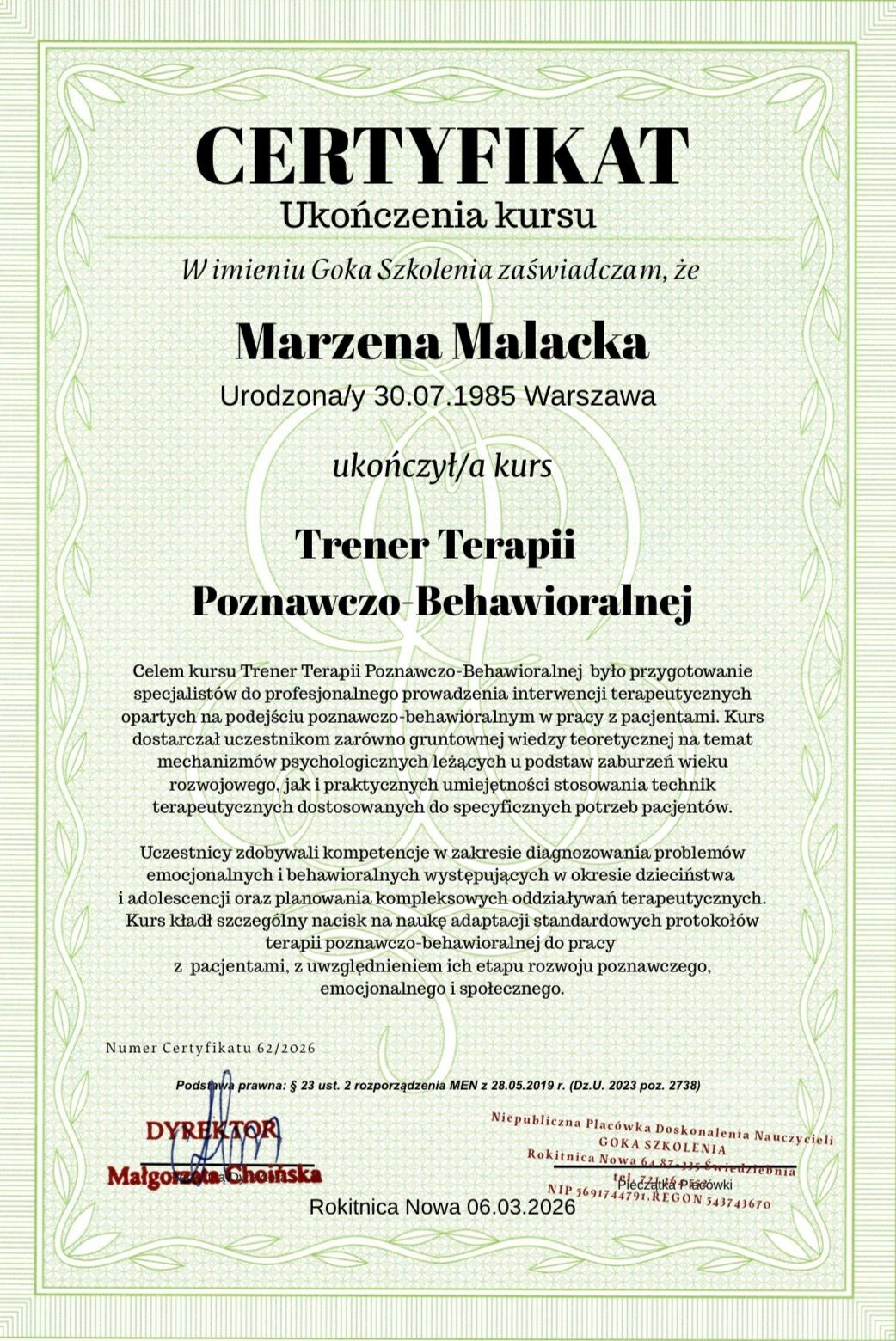 jestem dyplomowanym psychologiem i coachem oraz trenerem terapii poznawczo- behawioralnej.