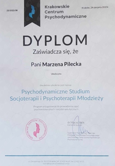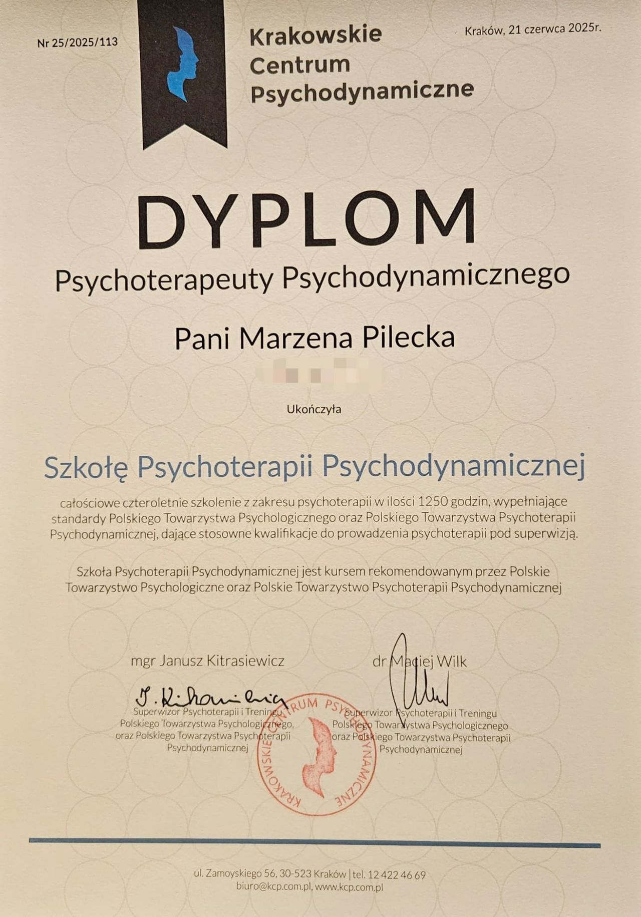 Jestem dyplomowanym psychoterapeutą psychodynamicznym. Pracuję z młodzieżą i dorosłymi. Zajmuję się również psychoedukacją, psychoprofilaktyką, socjoterapią oraz wsparciem w kryzysie. Jestem absolwentką 4-letniego całościowego szkolenia z psychoterapii w Szkole Psychoterapii Psychodynamicznej Krakowskiego Centrum Psychodynamicznego. Ukończyłam Psychodynamiczne studium socjoterapii i psychoterapii młodzieży oraz studia podyplomowe z zakresu Poradnictwa psychologicznego i interwencji kryzysowej. Jestem członkiem Polskiego Towarzystwa Psychoterapii Psychodynamicznej oraz Polskiego Stowarzyszenia Socjoterapeutów. Uzyskałam certyfikat Trenera Umiejętności Społecznych. Odbyłam staż na III Oddziale Ogólnopsychiatrycznym w Samodzielnym Publicznym Specjalistycznym