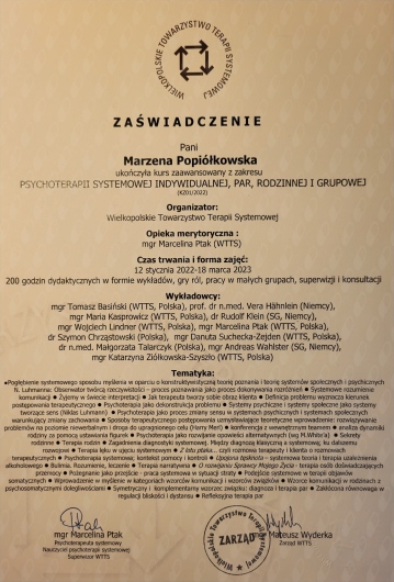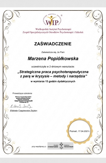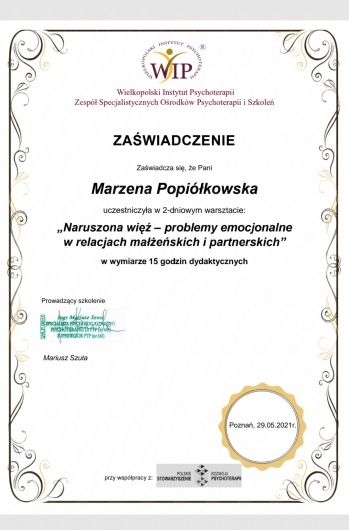 - Warsztaty ,,Psychoterapia Par i Małżeństw" w Wielkopolskim Instytucie Psychoterapii, o tematyce problemów emocjonalnych w parze przy naruszonej więzi, które dodatkowo wzbogacają moją wiedzę w pracy z parami
