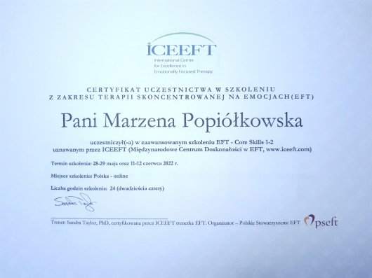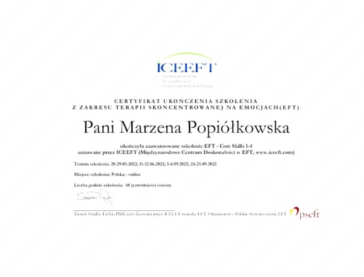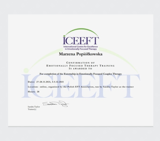 - Szkolenie EFT ,,Terapia Par Oparta na Emocjach" z Sandrą Taylor z brytyjskiej szkoły pod patronatem polskiego PSEFT . W terapii par towarzysze osobom w zaobserwowaniu i zrozumieniu swojego negatywnego cyklu oraz podjęciu decyzji do zmiany. Staram się aby każdy miał takie same szanse wyrażenia swego bólu, żalu i potrzeb. W pracy z parą pomagam odnajdywać nowe rozwiązania dla starych problemów, pokazać i utrwalić nowe cykle zachowań, pomóc w identyfikacji wypartych pragnień i potrzeb a co najważniejsze ustanowić silną więź emocjonalną w parze.