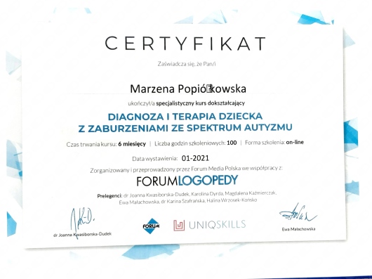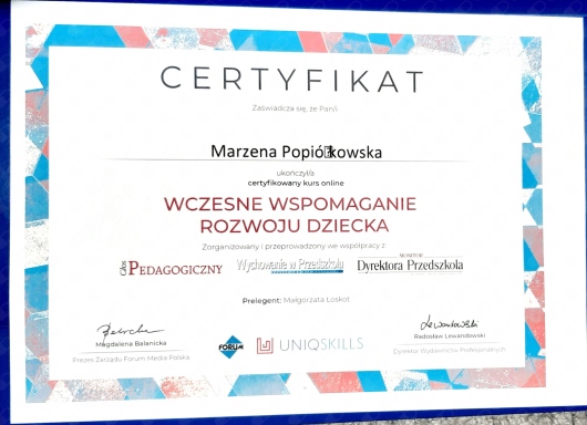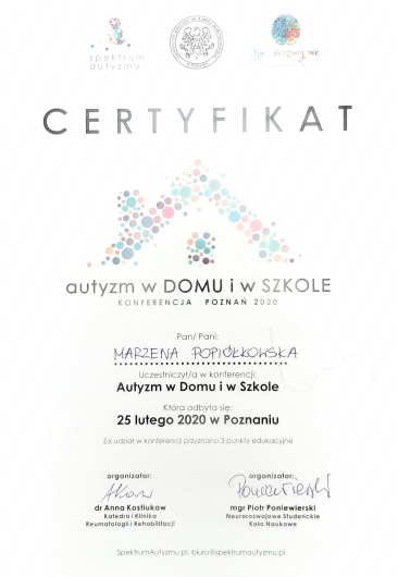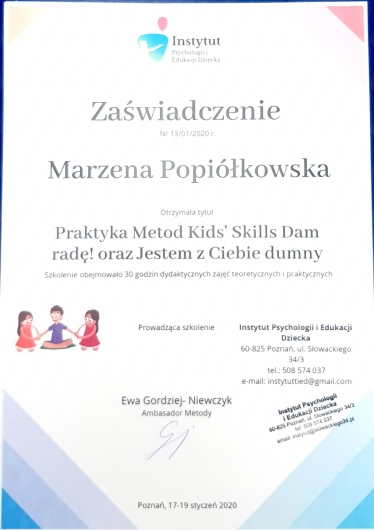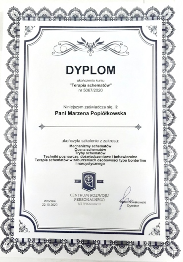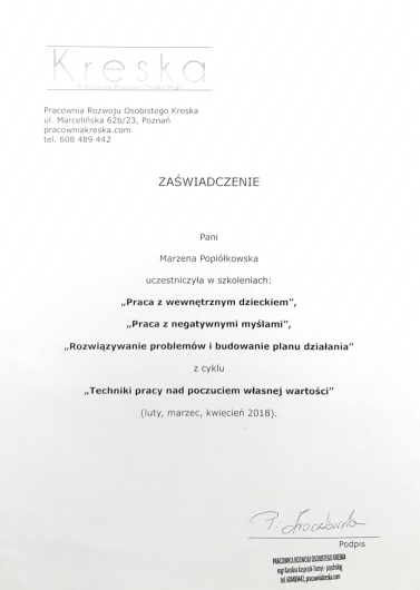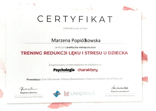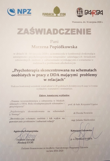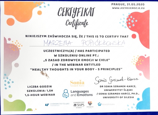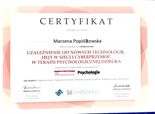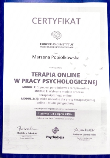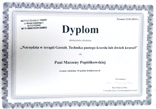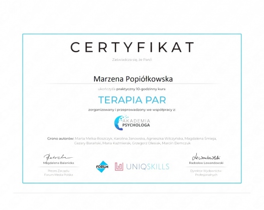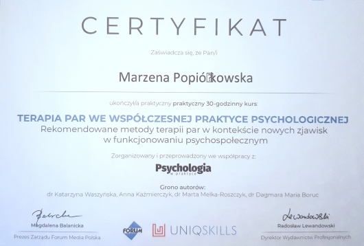 - Szkolenie ,,Terapia Par we współczesnej praktyce psychologicznej", gdzie poznałam rekomendowane metody terapii par w kontekście nowych zjawisk w funkcjonowaniu psychospołecznym