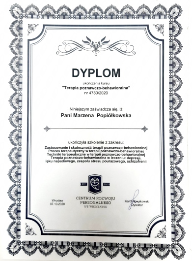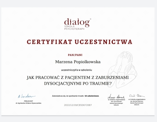 Dodatkowo odbyłam szkolenia z innych obszarów pracy z pacjentem i innych nurtów psychoterapeutycznych tj: