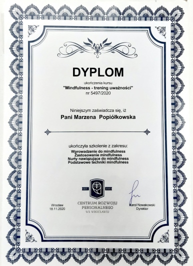 Każdy z nas jest inny, każdy też potrzebuje mojego indywidualnego podejścia i wykorzystania innych narzędzi dlatego też nie poprzestaje na nauce i doskonaleniu się i cały czas poszerzam swoją wiedzę o kolejne warsztaty.
