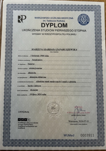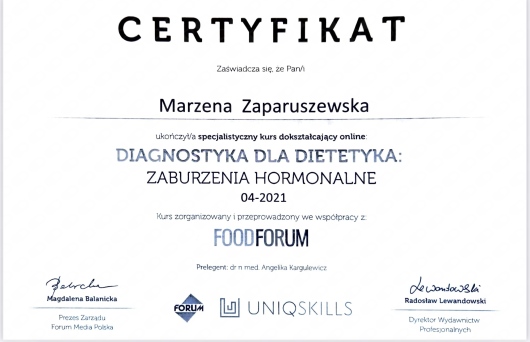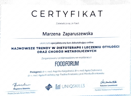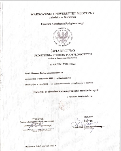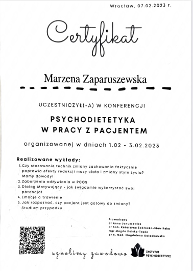 Regularnie uczestniczę w szkoleniach i konferencjach z zakresu dietoterapii. Stale poszerzam swoje kwalifikacje. Wspieram w procesie zmiany nawyków żywieniowych.