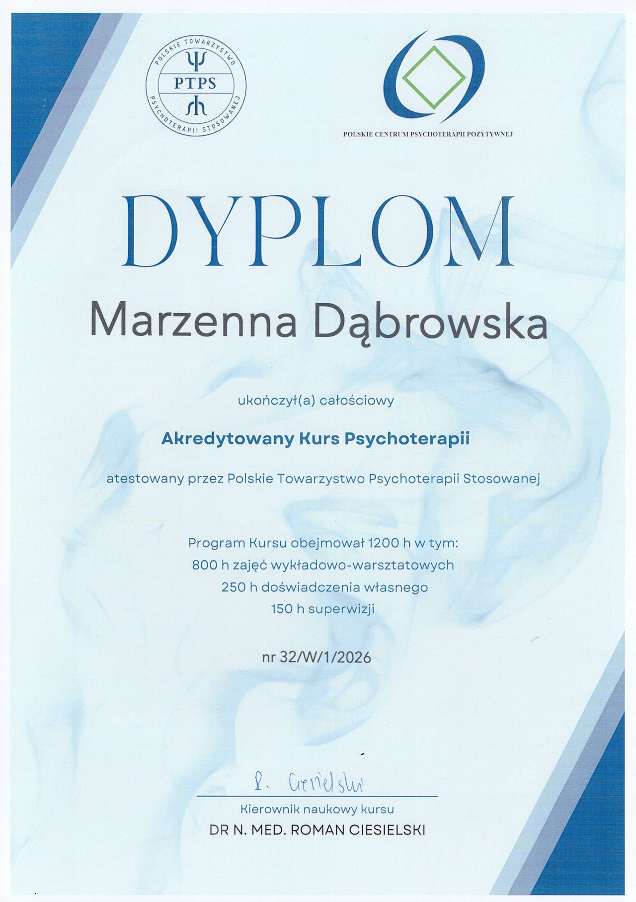 Mgr Marzenna Dąbrowska – jestem psychologiem, psychoterapeutą Psychoterapii Pozytywnej Transkulturowej (w trakcie szkolenia) i terapeutą EMDR. Ukończyłam studia o specjalności psychologia kliniczna na Uniwersytecie SWPS w Sopocie, I i II stopień terapii EMDR oraz czteroletni kurs Psychoterapii Pozytywnej Transkulturowej na poziomie Master. Nurt, w którym pracuję, jest akredytowany przez europejskie i światowe organizacje zrzeszające szkoły psychoterapii, m.in. European Wide Accrediting Organization (EWAO), Europejskie Stowarzyszenia Psychoterapii (EAP), Międzynarodową Federację Psychoterapii (IFP), oraz Światową Radę Psychoterapii (WCP). Należę do stowarzyszenia World Association for Positive and Transcultural Psychotherapy, Polskiego Towarzystwa Psychoterapii Stosowanej oraz Polskiego Towarzystwa Terapii EMDR. Swoją pracę poddaję stałej superwizji. W czasie sesji korzystam z różnych metod i narzędzi. Psychologia i pomoc psychologiczna zawsze była w centrum moich zainteresowań. W pracy z Klientem przestrzegam zasad dyskrecji, etyki i szacunku do Jego wewnętrznego świata. Pragnę Mu towarzyszyć w niezwykłej przygodzie, jaką jest zmiana, by uczynił swoje życie bardziej satysfakcjonującym. Nossrat Peseschkian (twórca Transkulturowej Psychoterapii Pozytywnej) powiedział: „Jeśli chcesz mieć coś, czego nie miałeś nigdy wcześniej, musisz zrobić coś, czego nie robiłeś dotychczas”. Może teraz jest Twój czas, by coś zmienić? Udzielam wsparcia i pomocy tym, którzy doświadczyli trudnych przeżyć, cierpią z powodu wspomnień, lęków, mają obniżony nastrój i szukają rozwiązania konfliktów wewnętrznych i interpersonalnych. Zapraszam ko kontaktu osoby dorosłe i pary.