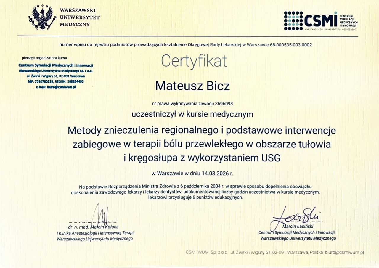 Jestem lekarzem w trakcie specjalizacji z anestezjologii i intensywnej terapii, z pasją i praktycznym doświadczeniem w leczeniu bólu ostrego oraz przewlekłego. Na co dzień pracuję z pacjentami, którzy zmagają się z bólem ograniczającym ich codzienne funkcjonowanie – bólem kręgosłupa, stawów, neuralgiami, bólem pooperacyjnym, pourazowym czy zespołami bólowymi o podłożu neuropatycznym i psychosomatycznym.