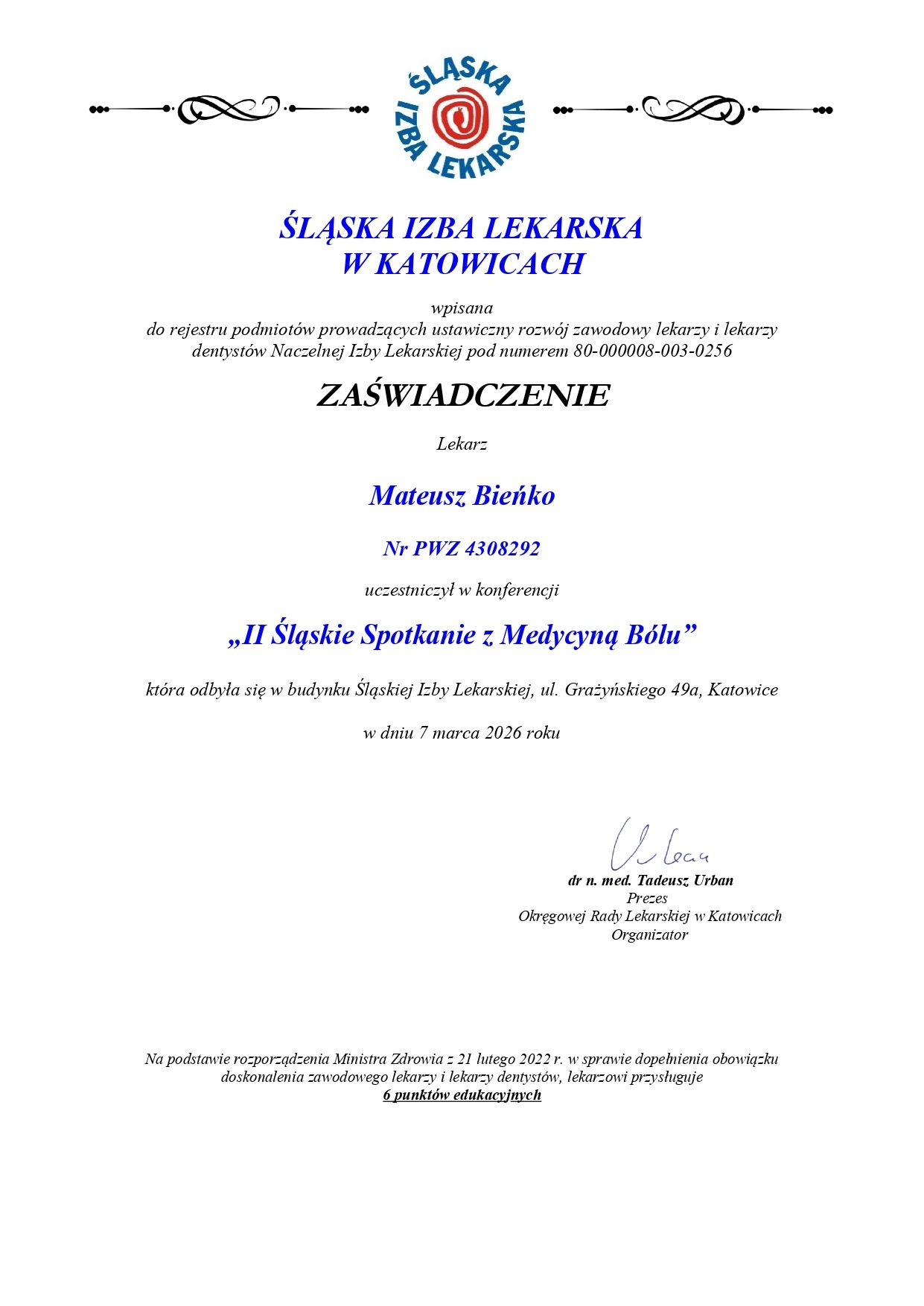 Jak Mateusz Bieńko umawia wizyty?Mateusz Bieńko używa kalendarza ZnanyLekarz, dlatego na stronie widzisz aktualne terminy. Wystarczy, że wybierzesz datę i godzinę, które odpowiadają Ci najbardziej. Umawianie wizyty jest darmowe, a tuż przed terminem wyślemy Ci przypomnienie.