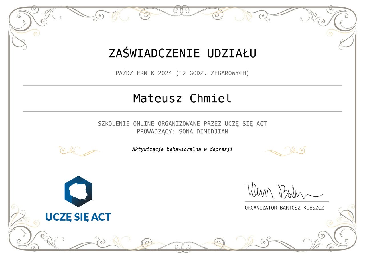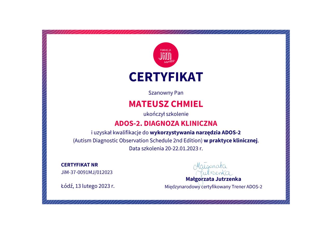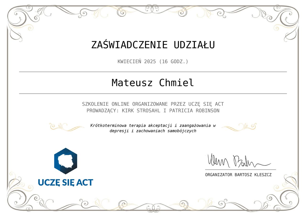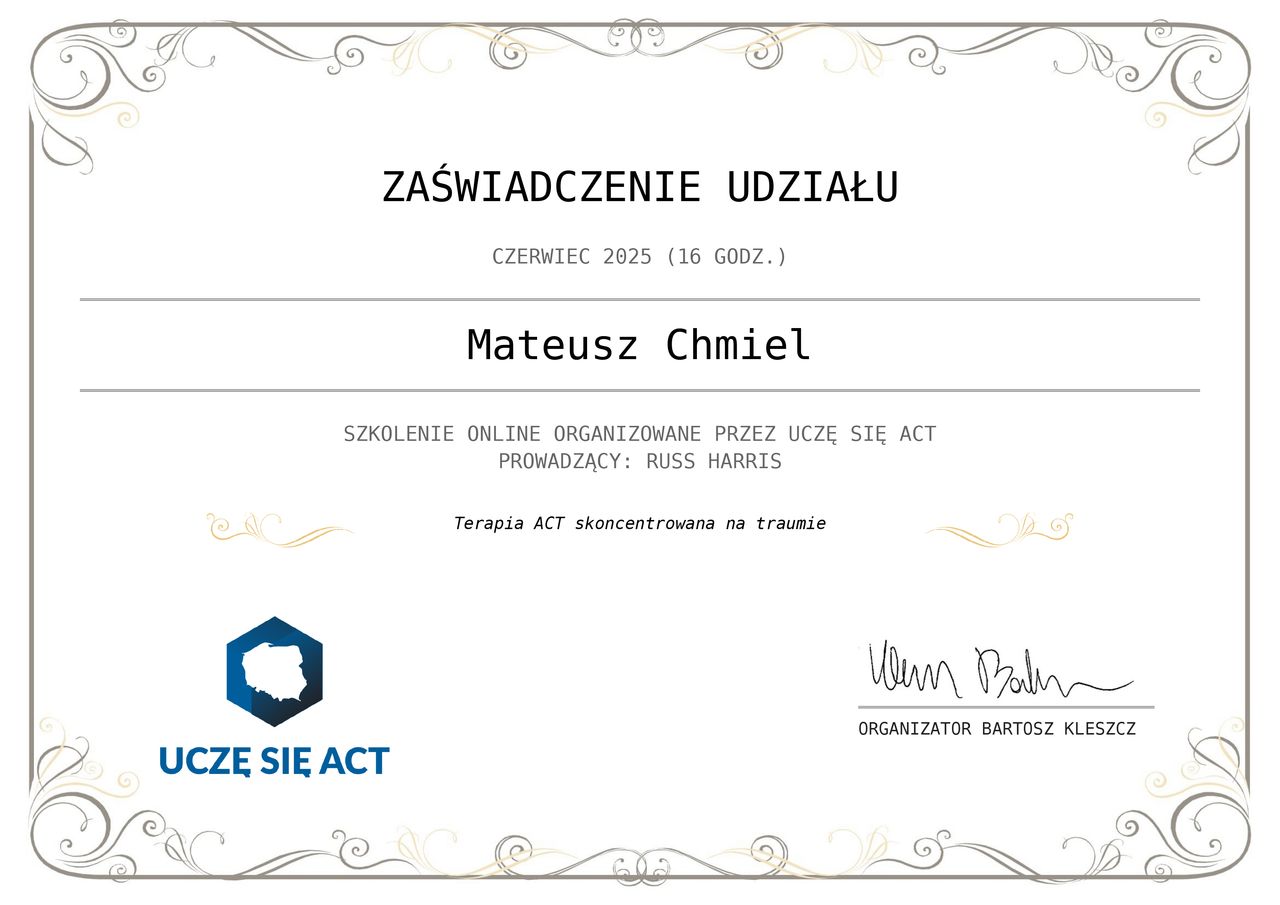 Nazywam się Mateusz Chmiel. Jestem psychologiem oraz psychoterapeutą w trakcie certyfikacji. Ukończyłem również ASP w Warszawie. Pracuje głównie w nurcie Terapii Akceptacji i Zaangażowania ACT.