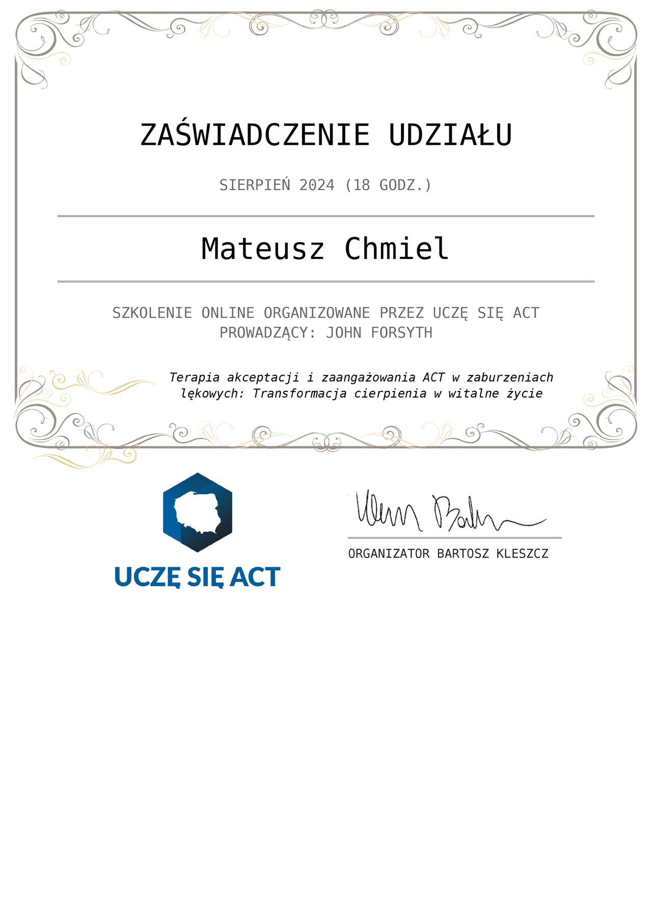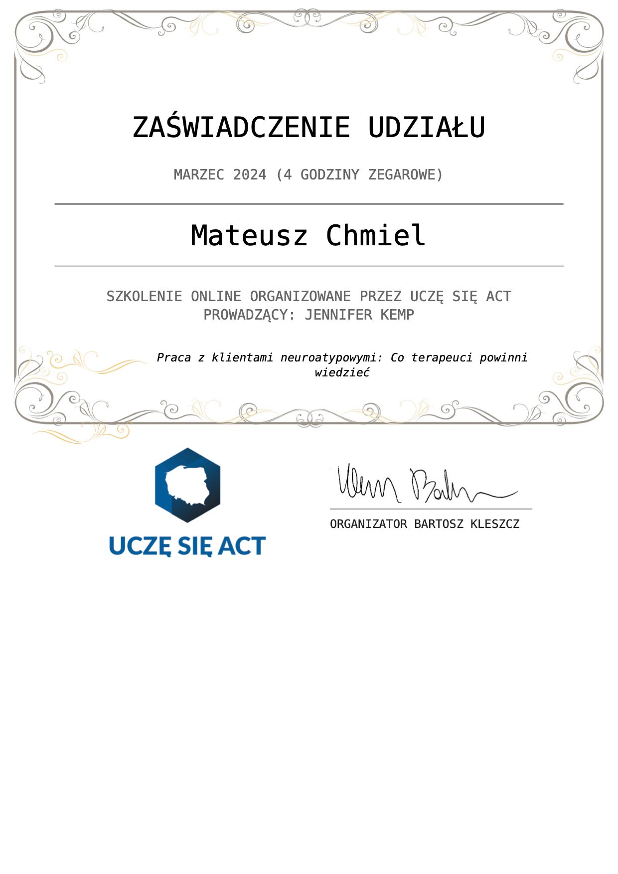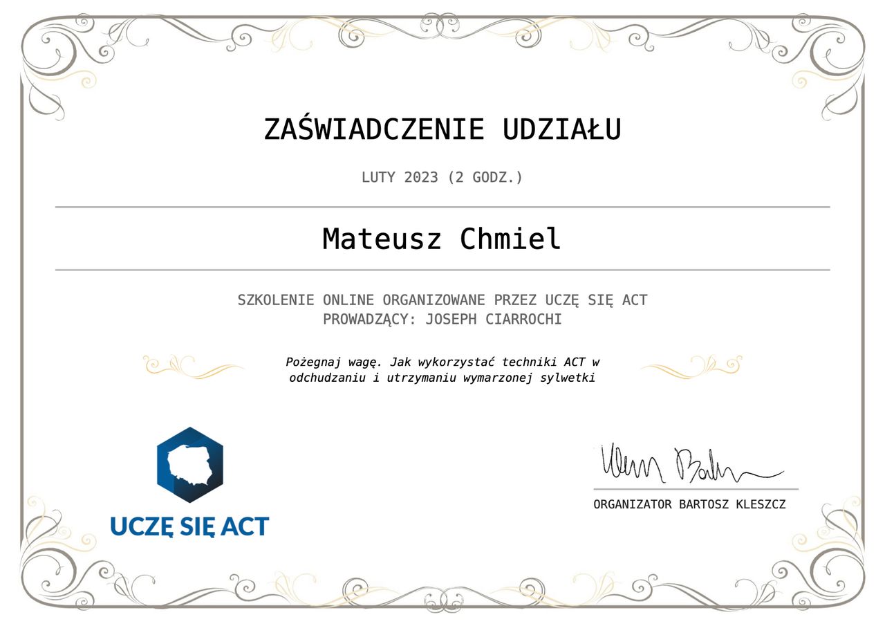 Nazywam się Mateusz Chmiel. Jestem psychologiem oraz psychoterapeutą w trakcie certyfikacji. Ukończyłem również ASP w Warszawie. Pracuje głównie w nurcie Terapii Akceptacji i Zaangażowania ACT.