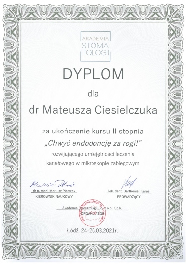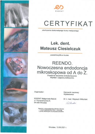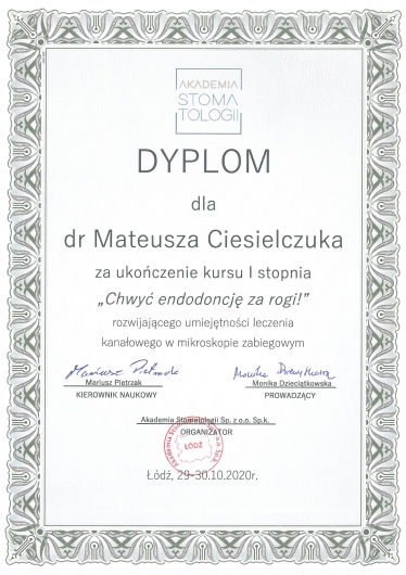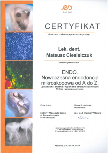 Jaki jest zakres porad oferowanych przez Mateusz Ciesielczuk?Mateusz Ciesielczuk to stomatolog. Na podstawie swojego doświadczenia i wykształcenia Mateusz Ciesielczuk oferuje usługi takie jak: konsultacja endodontyczna, konsultacja protetyczna, Konsultacja stomatologiczna, Endodoncja mikroskopowa, leczenie kanałowe pod mikroskopem, udrożnienie kanału pod mikroskopem.