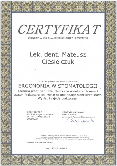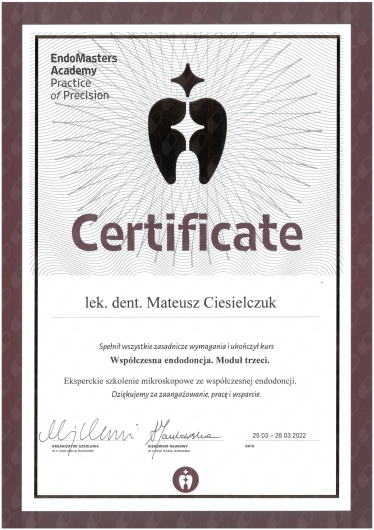 Bardzo polecam dr Ciesielczuka. Wciąż jestem pod wrażeniem jego empatii, spokoju i dbałości o komfort pacjenta. W trakcie wizyty (Medicover) otrzymałam szczegółowe i jasne wyjaśnienia co do stanu zęba, przebiegu leczenia i postępowaniu po. Nigdy nie sądziłam, że leczenie kanałowe zęba( które do tej pory napawało mnie przerażeniem po poprzednich doświadczeniach) może przebiec tak bezboleśnie i komfortowo.