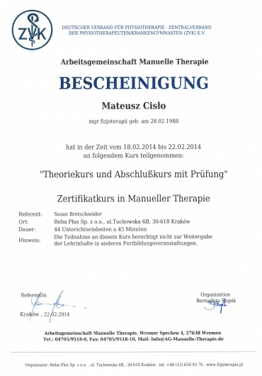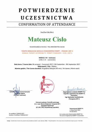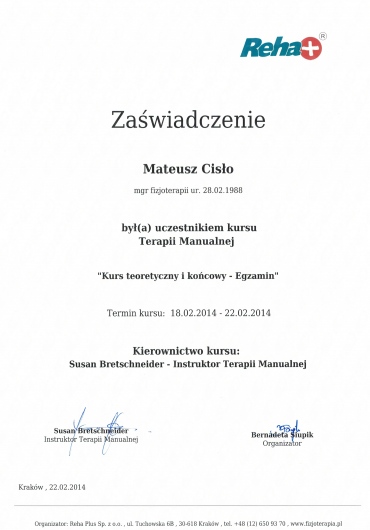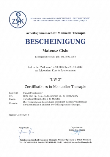 Bardzo polecam wizyty u Pana Mateusza, który jest po prostu profesjonalistą - wiedza, umiejętności i wszechstronne spojrzenie na problem. Dzięki jego indywidualnemu i holistycznemu podejściu do pacjenta, pozbyłam się wieloletniego przykurczu kolana, który utrudniał mi normalne funkcjonowanie każdego dnia i pogłębiał skutki wadliwej postawy. Dzisiaj kolano jest wyprostowane i ból nogi już mi nie dokucza - a ja jako pacjentka zyskałam radość i zadowolenie :D. Bardzo dziękuję.