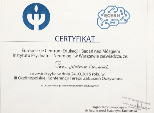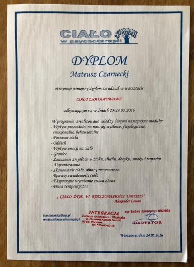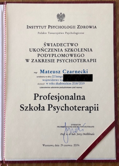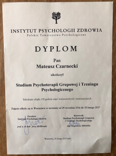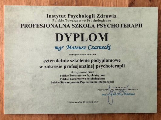 Nazywam się Mateusz Czarnecki i jestem m.in. dyplomowanym psychoterapeutą oraz prezesem Ośrodka Psychoterapii M.Czarnecki & Co. Ukończyłem Profesjonalną Szkołę Psychoterapii prowadzoną przez Instytut Psychologii Zdrowia przy Polskim Towarzystwie Psychologicznym (akredytowaną przez Sekcję Naukową Psychoterapii Polskiego Towarzystwa Psychiatrycznego, Polskie Towarzystwo Psychologiczne oraz Polskie Stowarzyszenie Psychoterapii Integracyjnej). Doświadczenie zawodowe zdobywałem m.in. w Klinice Nerwic, Zaburzeń Osobowości i Odżywiania w Instytucie Psychiatrii i Neurologii (IPiN) w Warszawie, w Ośrodku Psychoterapii Instytutu Psychologii Zdrowia "Ogród" oraz prowadząc praktykę prywatną. W 2017 roku założyłem Ośrodek Psychoterapii M.Czarnecki & Co. na ul. Mokotowskiej 23 w Warszawie, w którym wraz z zespołem prawie 30 starannie wyselekcjonowanych, zaufanych psychologów i psychoterapeutów pomagam naszym pacjentom. I bardzo lubię tą pracę. Swoją pracę poddaję stałej superwizji certyfikowanych superwizorów z Polskiego Towarzystwa Psychologicznego i Polskiego Stowarzyszenia Psychoterapii Integracyjnej (w ramach superwizji indywidualnej i grupowej). Ukończyłem również m.in. Studium Pomocy Psychologicznej dla Par prowadzone przez Instytut Psychologii Zdrowia Polskiego Towarzystwa Psychologicznego, Studium Psychoterapii Grupowej i Treningu Psychologicznego prowadzone przez Instytut Psychologii Zdrowia Polskiego Towarzystwa Psychologicznego oraz szereg szkoleń i warsztatów z zakresu psychoterapii. Odbyłem także psychoterapię własną (indywidualną oraz grupową).