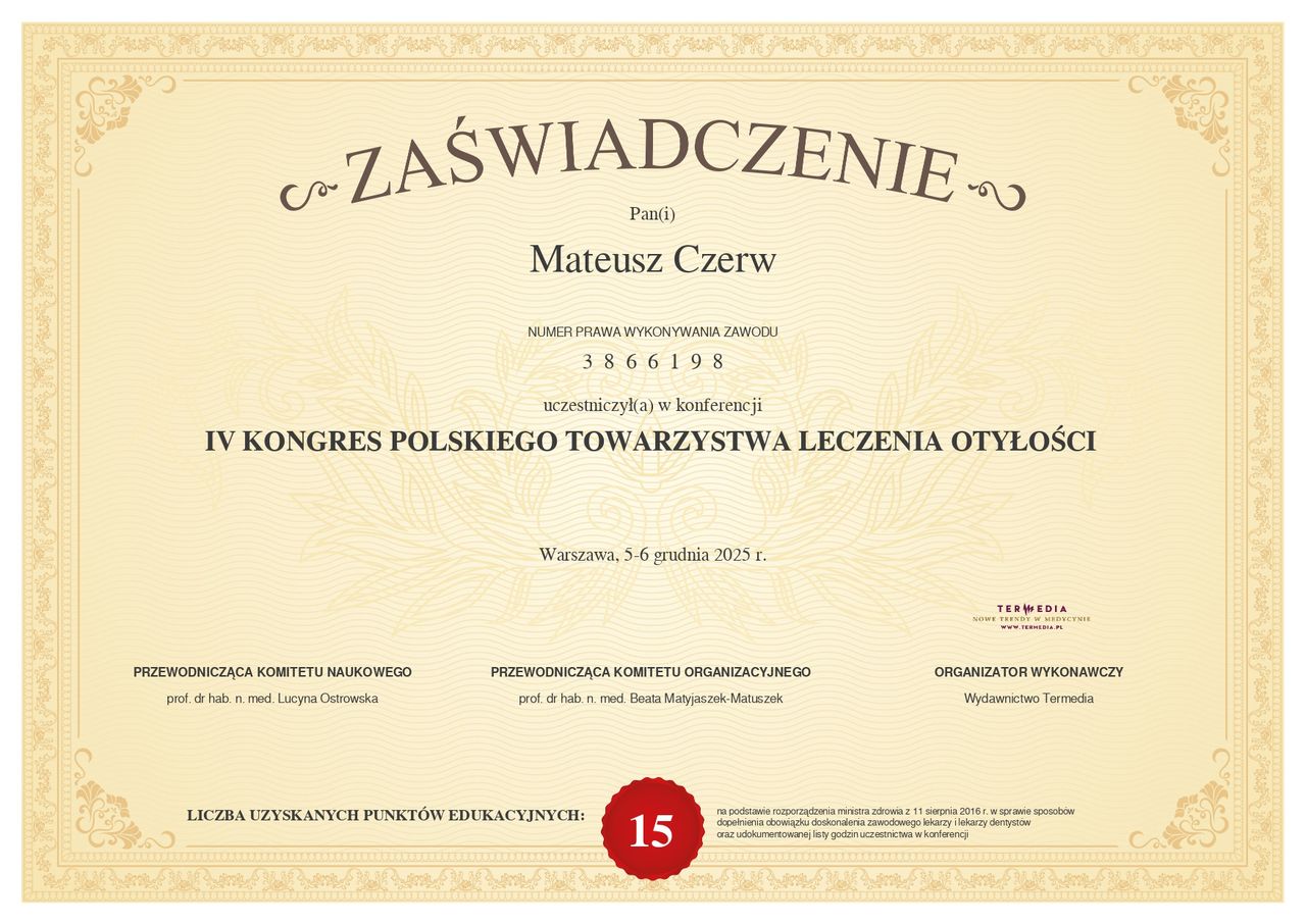 Jaki jest zakres porad oferowanych przez Mateusz Czerw?Mateusz Czerw to w trakcie specjalizacji (lekarz rodzinny). Na podstawie swojego doświadczenia i wykształcenia Mateusz Czerw oferuje usługi takie jak: Leczenie otyłości - wizyta kolejna, Leczenie otyłości - wizyta pierwsza, Konsultacja lekarska kolejna wizyta, Konsultacja lekarska pierwsza wizyta, konsultacja lekarza rodzinnego, Terapia bólu.