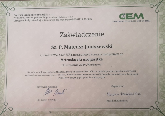 Jaki jest zakres porad oferowanych przez Mateusz Janiszewski?Mateusz Janiszewski to ortopeda. Na podstawie swojego doświadczenia i wykształcenia Mateusz Janiszewski oferuje usługi takie jak: konsultacja ortopedyczna + USG, zabiegi chirurgiczne, wiskosuplementacja, terapia Orthokine, Terapia osoczem bogatym w czynniki wzrostu- PRP, przeszczep komórek macierzystych, USG ortopedyczne z konsultacją, wizyta kontrolna po zabiegu, konsultacja reumatologiczna, konsultacja ortopedyczna.