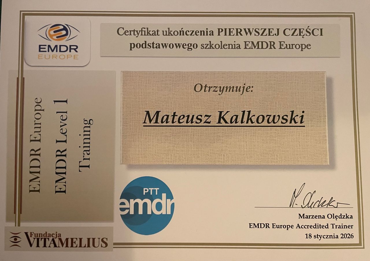Ukończyłem I stopień szkolenia terapii EMDR oraz jestem członkiem Polskiego Towarzystwa Terapii EMDR.