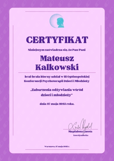 Cała nasza droga terapeutyczna pomogła mi lepiej zrozumieć siebie, zajrzeć w głąb własnych lęków i obaw oraz odnaleźć spokój i akceptację. Mateusz towarzyszył mi przez cały ten czas, wspierając mnie w każdej rozmowie i w każdym ćwiczeniu. Jestem ogromnie wdzięczny za jego pracę, empatię i wrażliwość, które okazywał przez cały okres naszych spotkań.