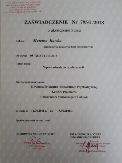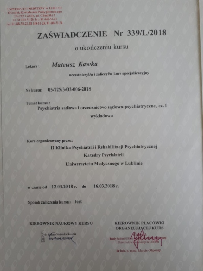 Jestem lekarzem, specjalistą w dziedzinie psychiatrii. Ukończyłem studia medyczne na Wydziale Lekarskim Collegium Medicum Uniwersytetu Mikołaja Kopernika w Toruniu.