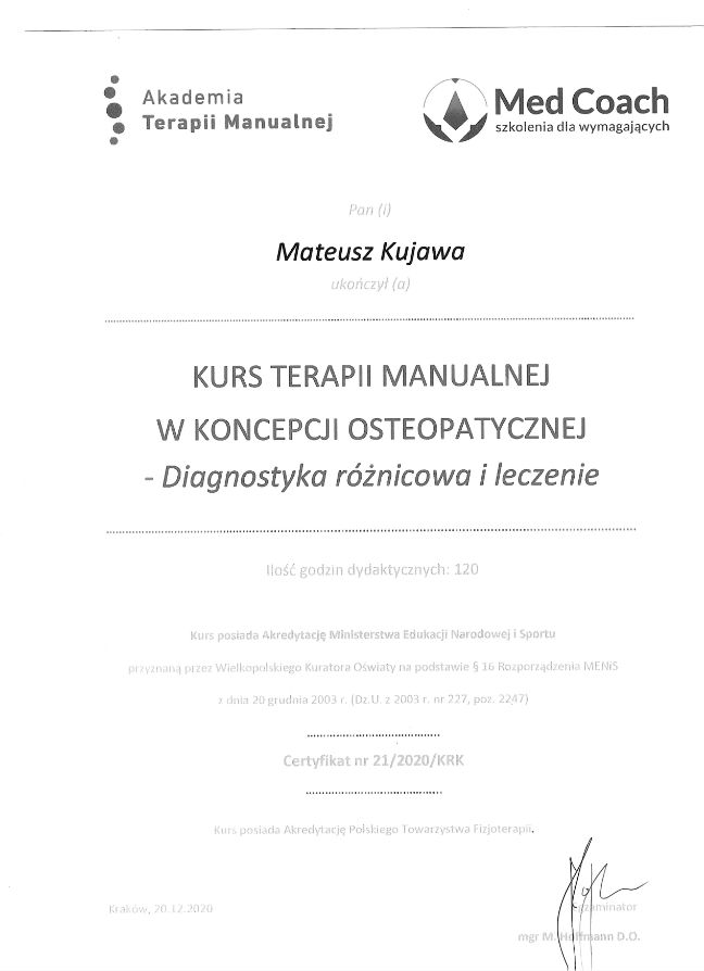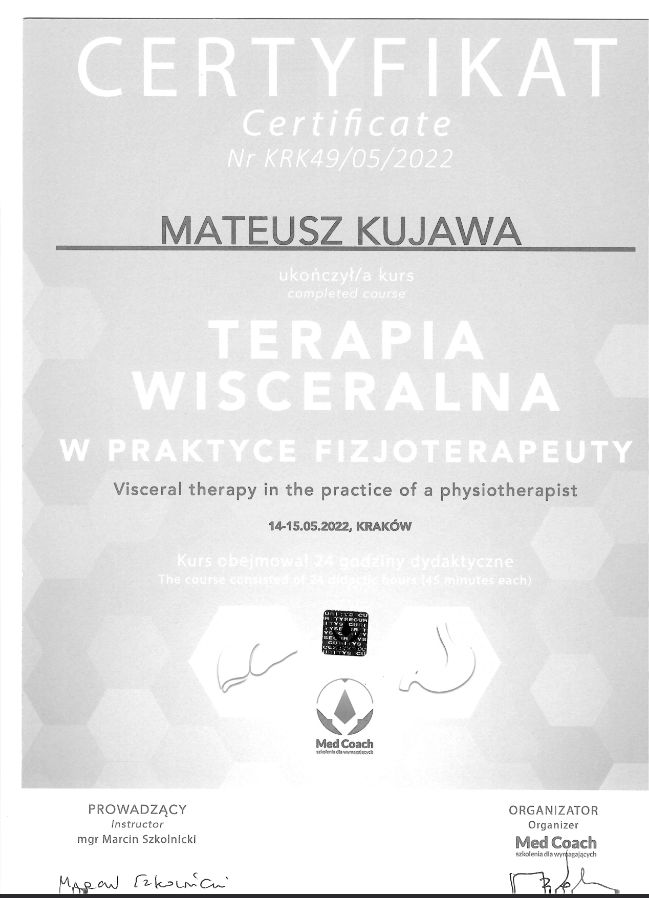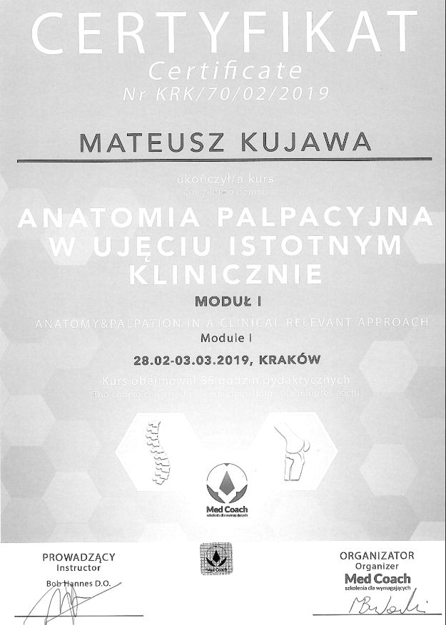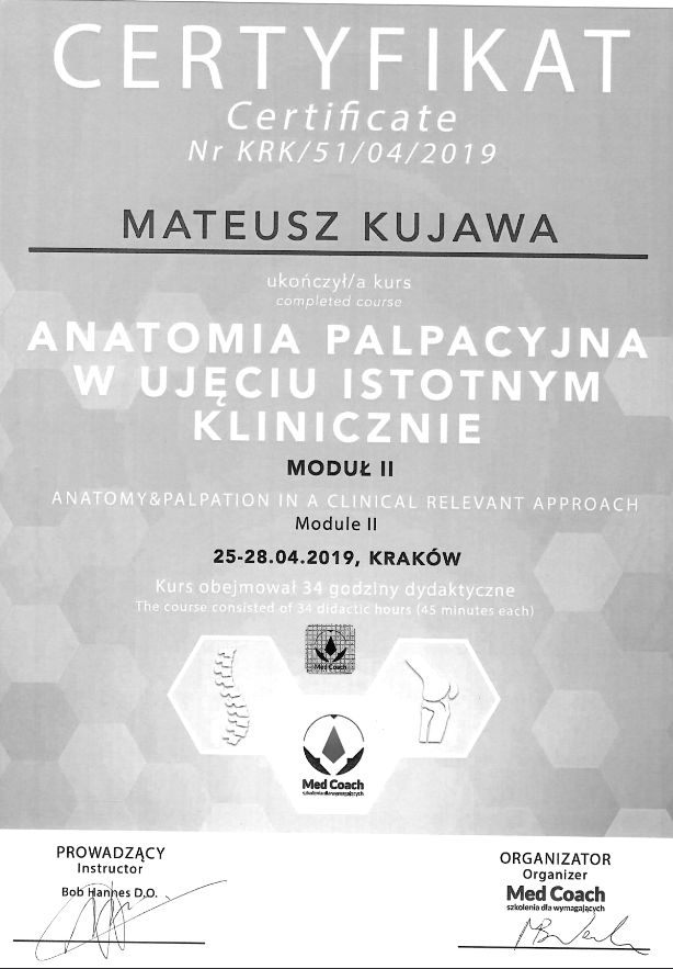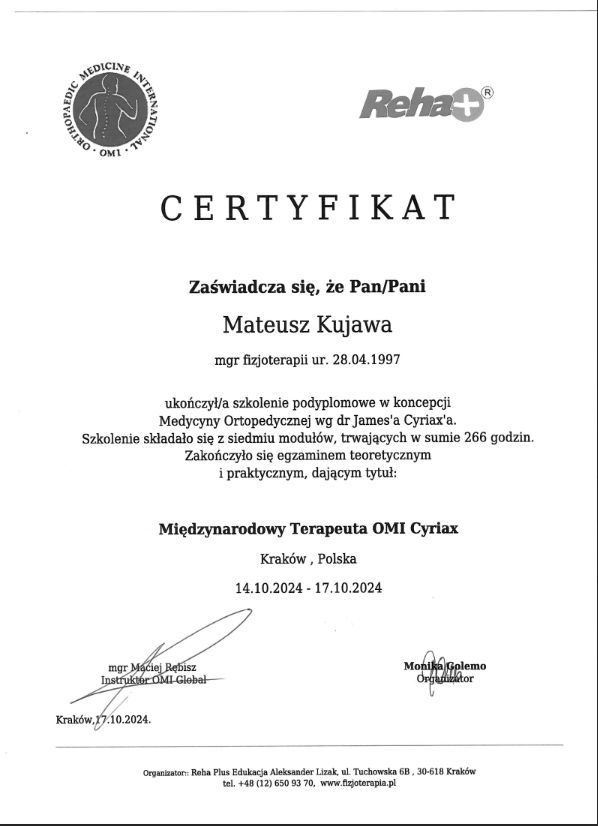 Jestem absolwentem Akademii Wychowania Fizycznego na kierunku fizjoterapia oraz dyplomowanym międzynarodowym terapeutą metody OMI Cyriax. Od samego początku mojej ścieżki edukacyjnej interesowała mnie medycyna manualna oraz jak najbardziej efektywna i szybka pomoc pacjentowi. W swojej praktyce zawodowej staram się łączyć różne podejścia i koncepcje terapeutyczne tak, aby jak najbardziej trafnie i skutecznie rozwiązywać problemy bólowe moich pacjentów. Specjalizuje się głównie w diagnostyce funkcjonalnej i terapii przewlekłych i ostrych zespołów bólowych związanych z narządem ruchu. Swoją wiedzę cały czas poszerzam poprzez liczne kursy doszkalające.