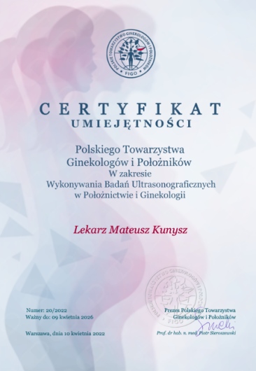 Jaki jest zakres porad oferowanych przez Mateusz Kunysz?Mateusz Kunysz to ginekolog. Na podstawie swojego doświadczenia i wykształcenia Mateusz Kunysz oferuje usługi takie jak: konsultacja ginekologiczna, USG ginekologiczne przez powłoki brzuszne, USG ginekologiczne transvaginalne, USG ciąży transvaginalne, USG płodu, wkładka domaciczna, prowadzenie ciąży, konsultacja ginekologiczna z założeniem wkładki pacjentki, USG ciąży 18-22 tyg., USG ciąży 28-32 tydz..