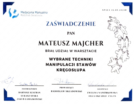 Jaki jest zakres porad oferowanych przez Mateusz Majcher?Mateusz Majcher to fizjoterapeuta. Na podstawie swojego doświadczenia i wykształcenia Mateusz Majcher oferuje usługi takie jak: konsultacja fizjoterapeutyczna, terapia mięśniowo-powięziowa, fizjoterapia, Terapia trzewna, wkładki ortopedyczne, terapia manualna + suche igłowanie, Manipulacja powięzi wg Stecco, kinesiotaping, rehabilitacja ortopedyczna, suche igłowanie.